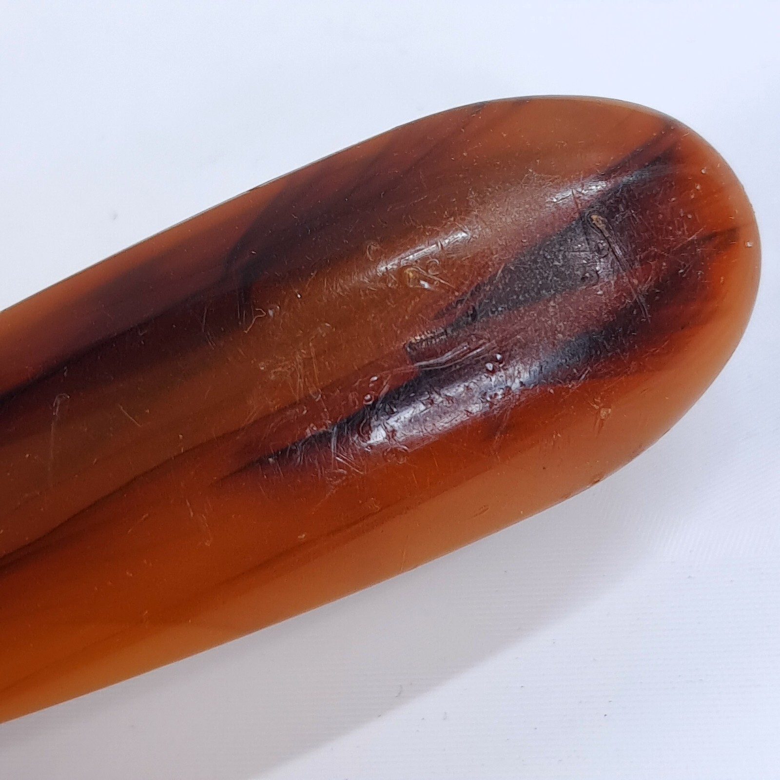 Some scratches/wear/marks as shown. Could use a bit more cleaning if desired. Carmel Butterscotch clear plastic style handle.