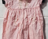 Vintage pink, lightweight baby Smock Dress. This has beautiful details. There are three functional buttons to close/unbutton the dress in the back. There are blue accents, two pockets, and three non-functional buttons on the front. There is no actual size or tag on the dress.