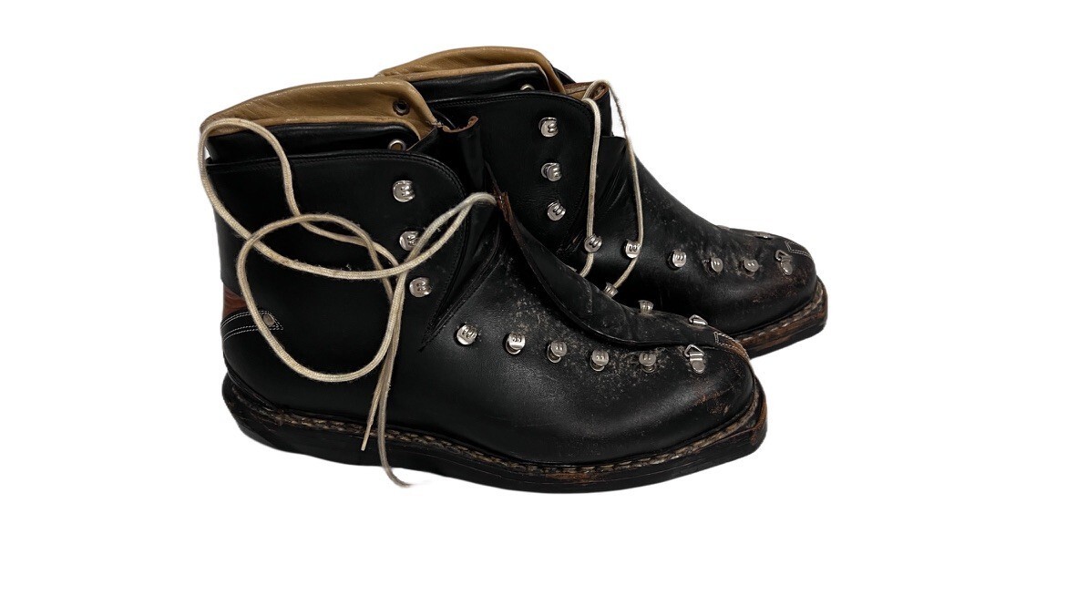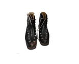 This is a pair of 1950's era leather Bass Brand Ski Boots. They are lace up type boots with a double boot construction. They have a lace inner boot and an outer boot that also laced up. They are size 10 1/2 but we surely do not recommend ever using them for skiing. We do, however, recommend them as unique decor items for any ski lodge or mountain cabin. Each boot weighs about 3 pounds and is 12.5 inches long.