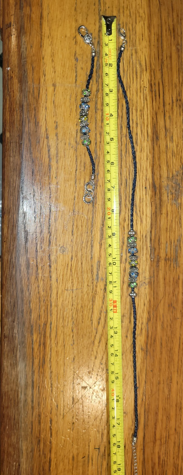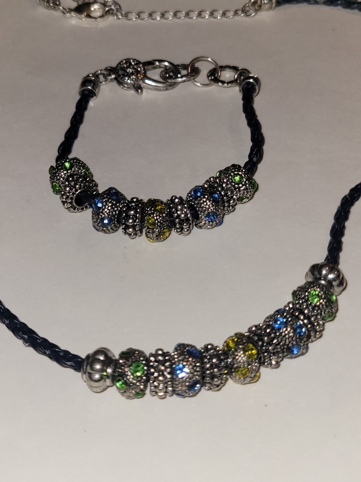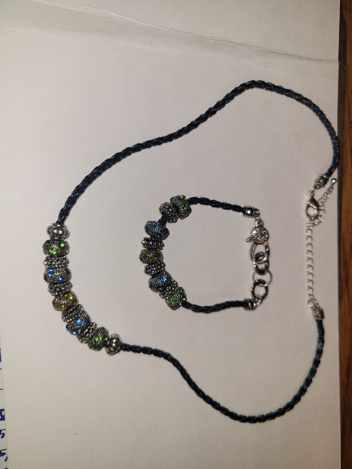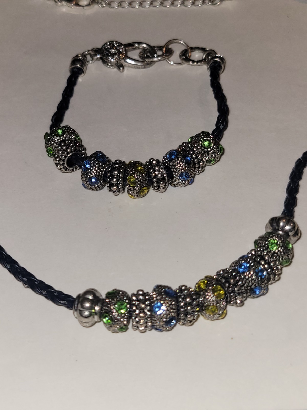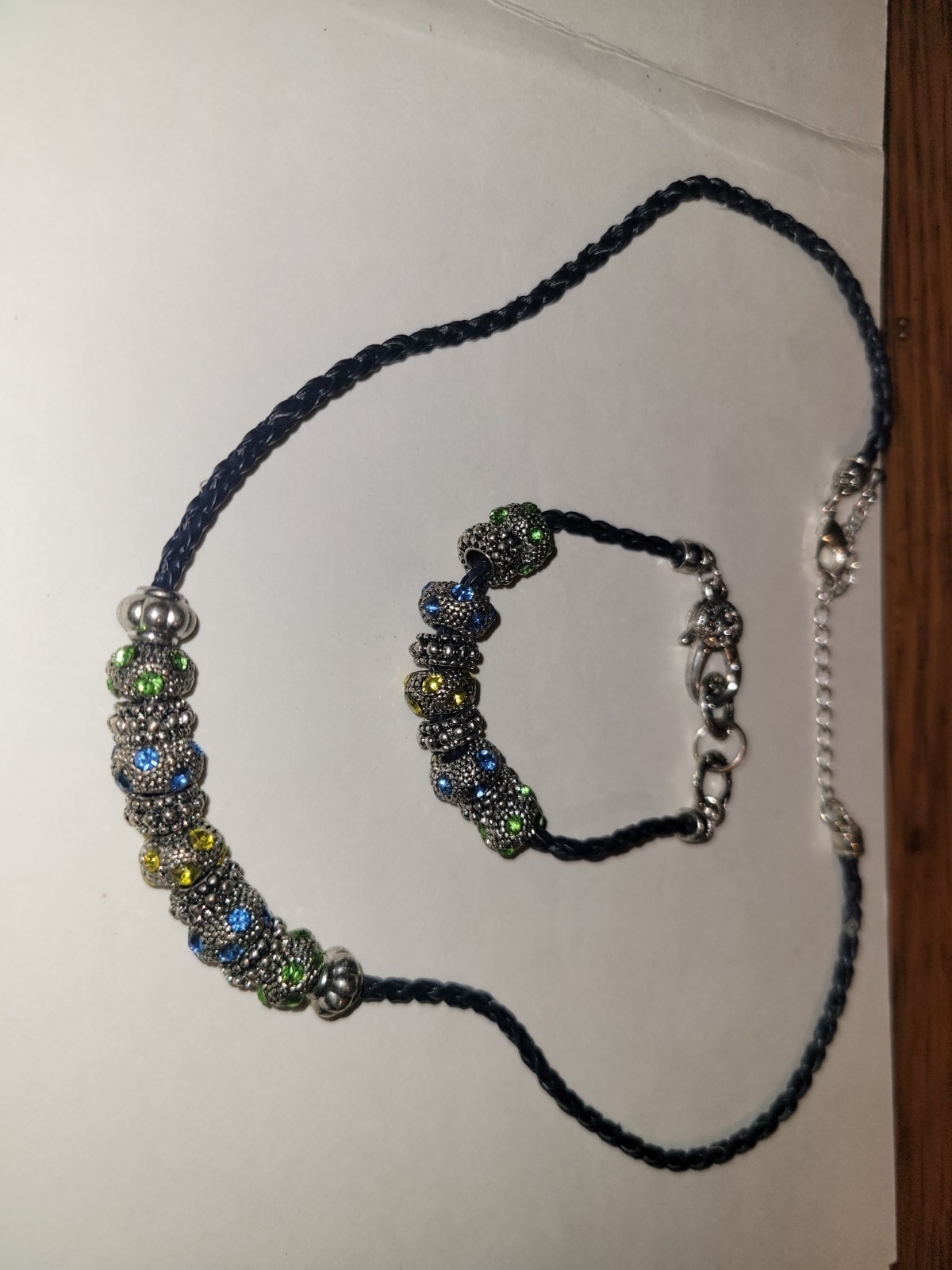 This vintage beaded necklace with a Pandora style design is a stunning accessory that includes a matching bracelet. The necklace features intricate silver charms that add a touch of elegance to any outfit. Perfect for those who appreciate unique and timeless jewelry pieces, this set is a stylish addition to any jewelry collection.