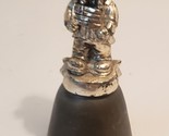 This vintage bell features a charming design of a bear wearing a top hat, made of gray-colored metal with a metallic finish. Standing at 4 inches tall, this small decorative collectible emits a pleasant sound when rung. The bell is unboxed and originates from China, showcasing intricate craftsmanship without being handmade. Perfect for all occasions, this bell adds a touch of whimsy to any space with its unique and nostalgic aesthetic.