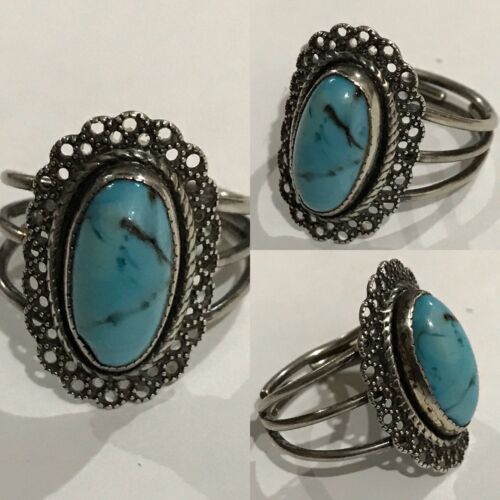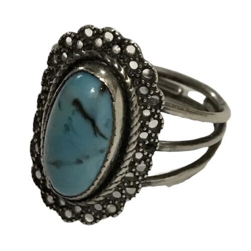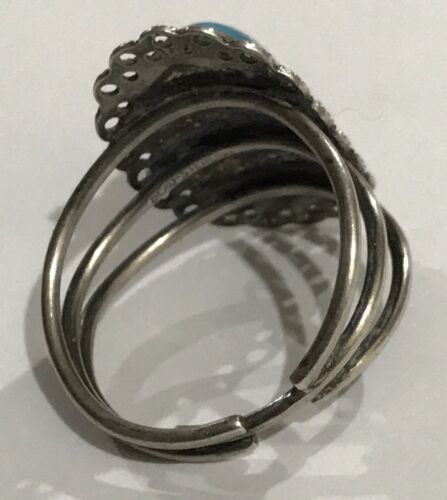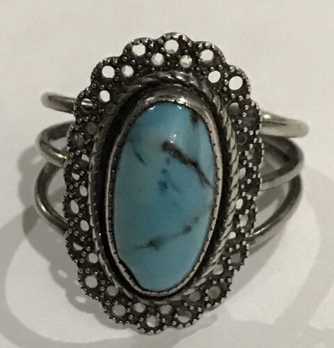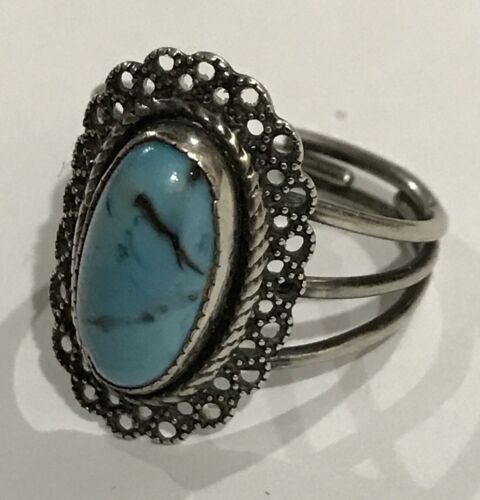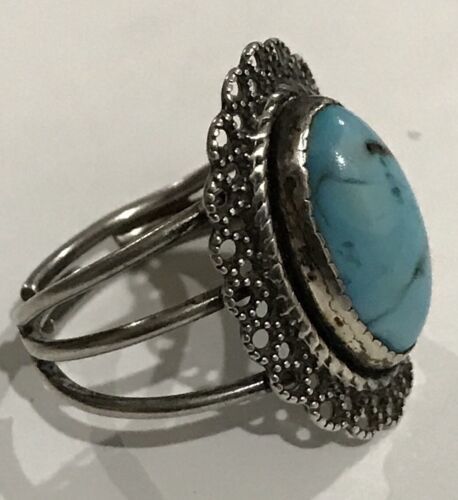 - Vintage Beau Signed Turquoise Cabochon Sterling Silver Filigree Adjustable Ring