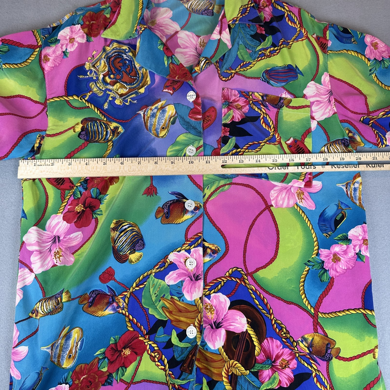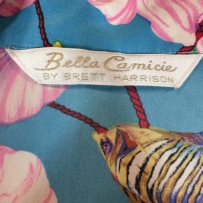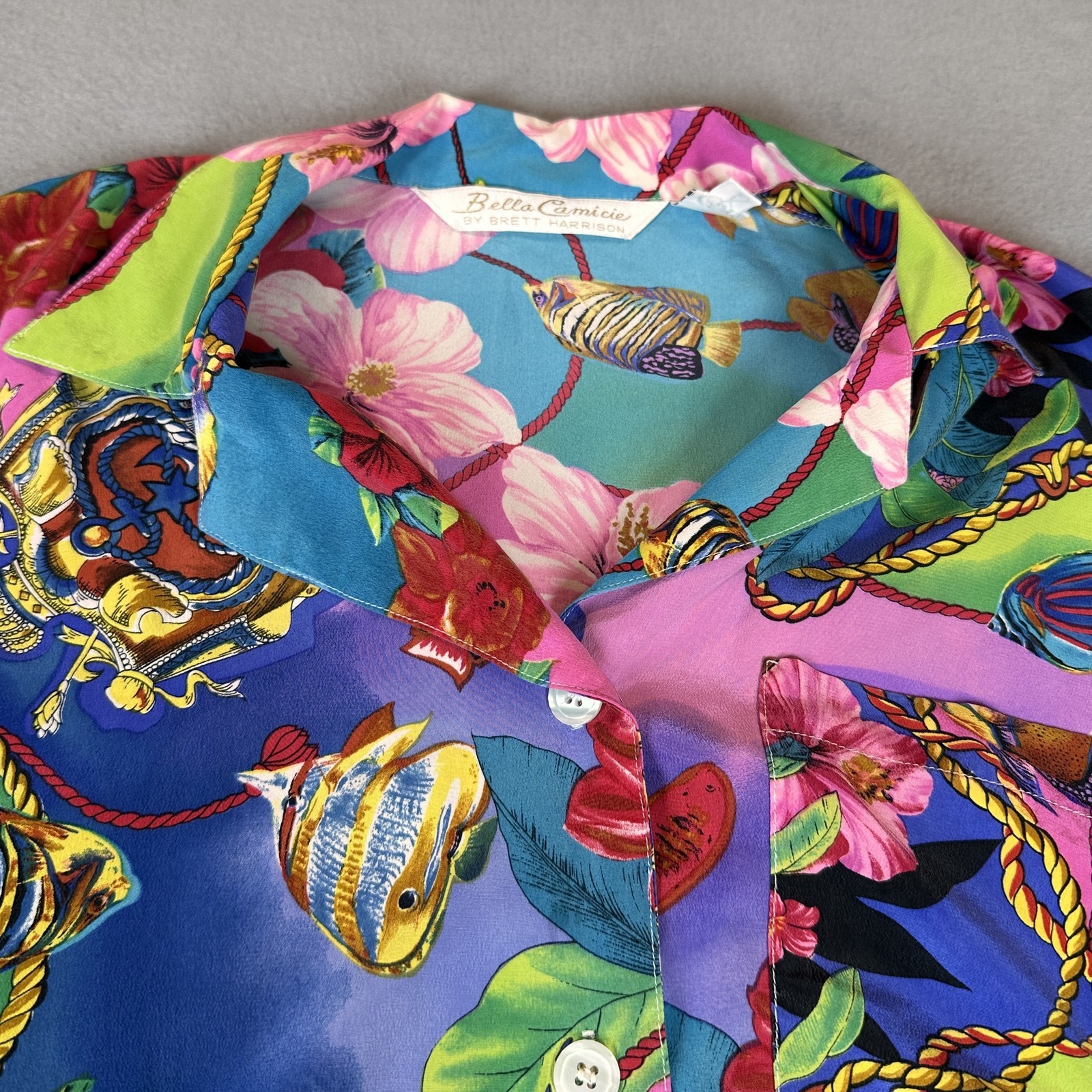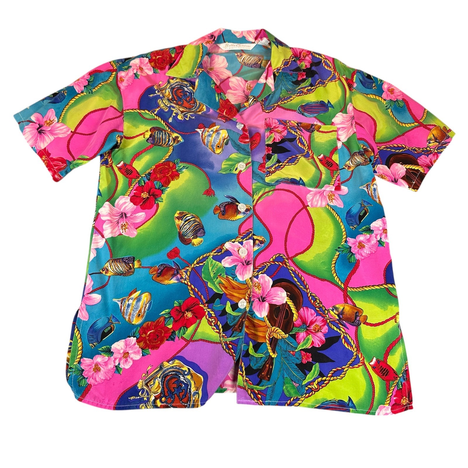 Bella Camicie Shirt Womens Small Multicolor Silk Hawaiian Floral Fish Print Vintage