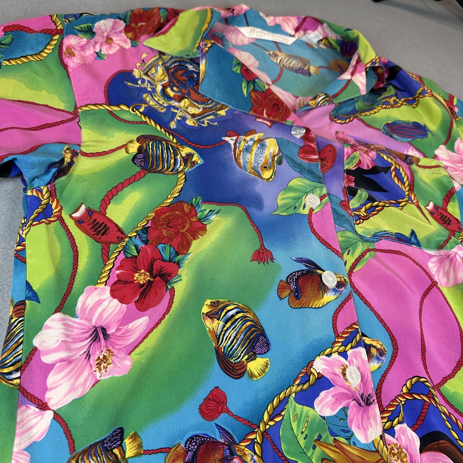Vintage Bella Camicie Shirt Womens Small Silk Hawaiian Floral Fish Print 90s