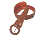 This heavy leather vintage belt has a lot of lacing and holes. It has a round leather covered buckle and looks like it could have been made in Mexico but is not marked. The vintage belt is 39? long with holes all along it so it can be adjusted accordingly and is 1 7/8? wide and is in excellent condition. Top quality too!