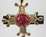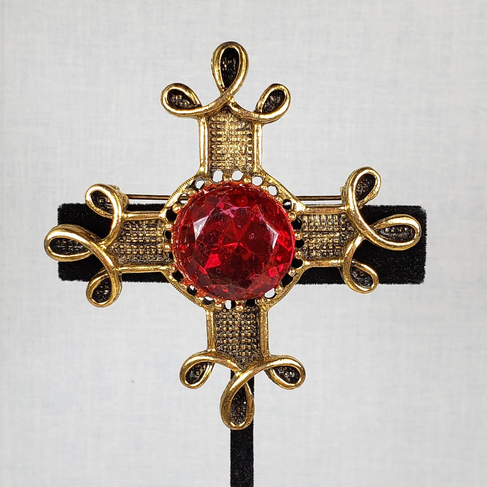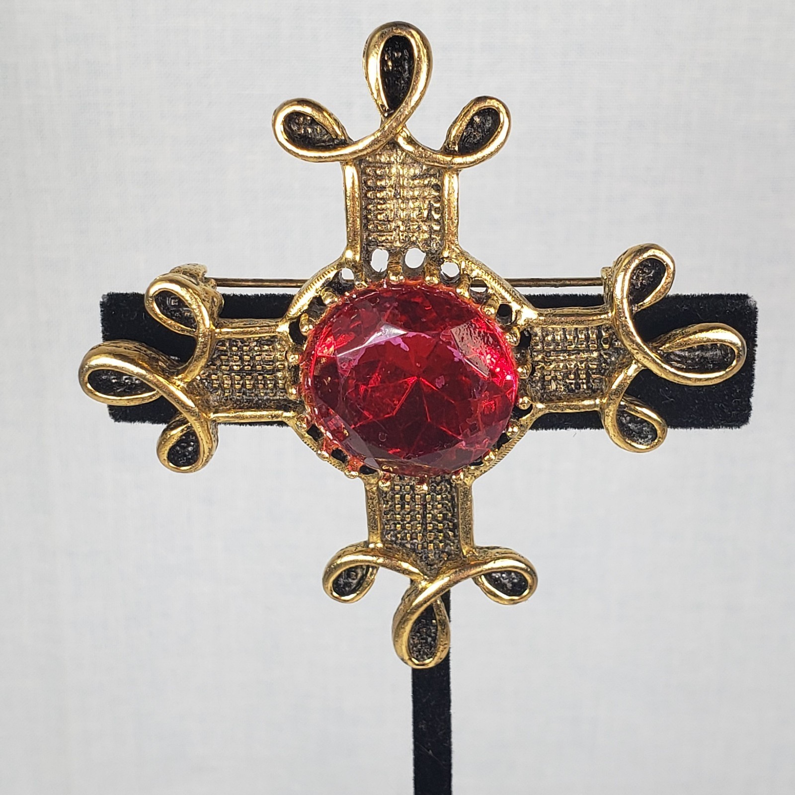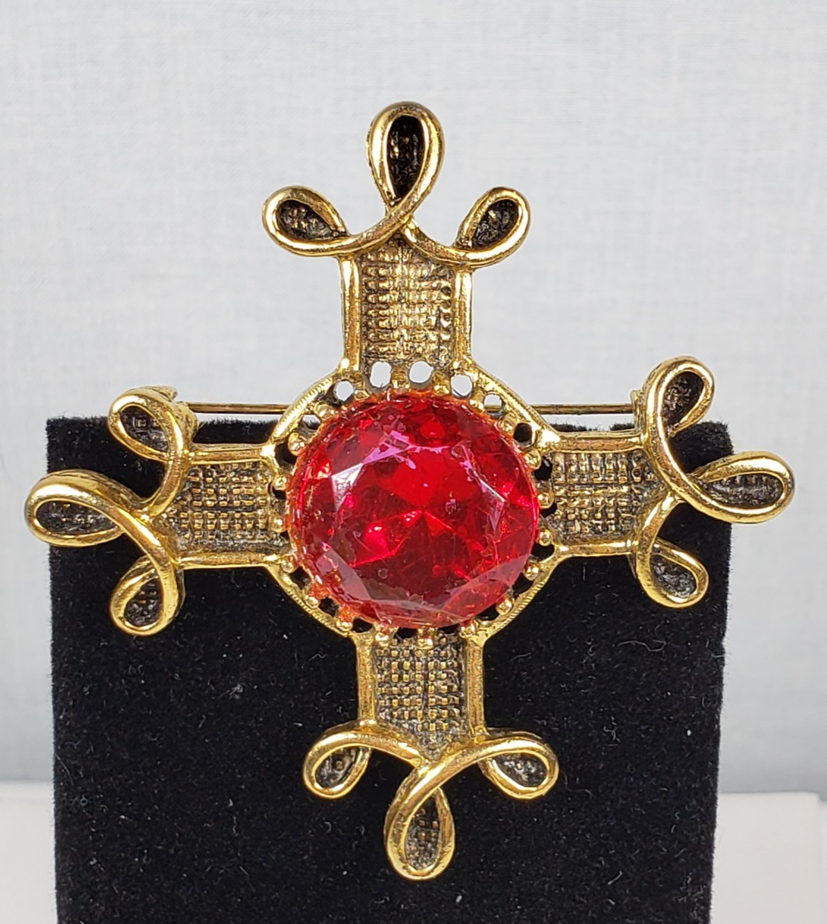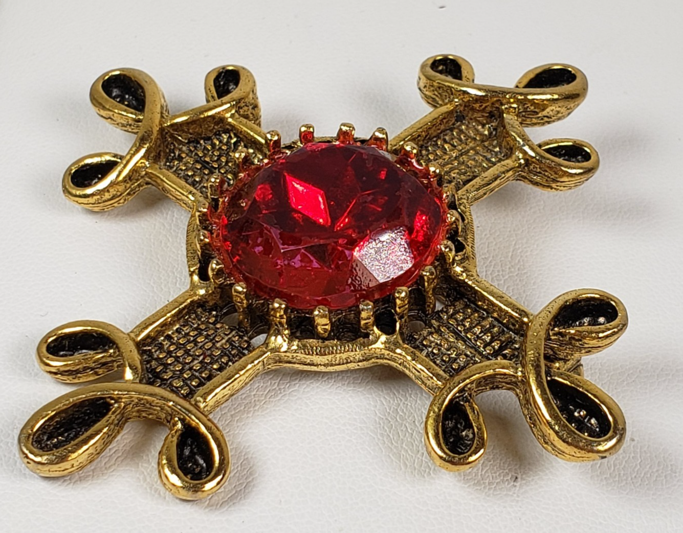 - Vintage Benedict Style Gold Tone Maltese Cross With Faceted Red Center Brooch