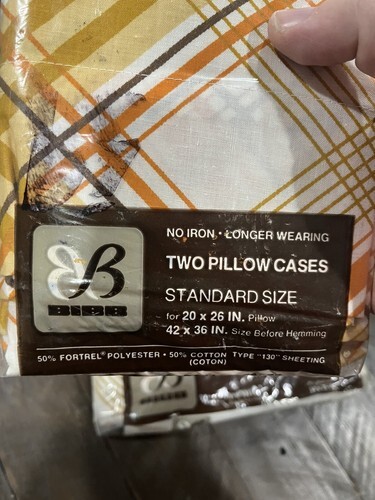 - Vintage Bibb Double Flat Sheet 2 Pillow Cases Brown Gold Orange Geo Line MCM NOS