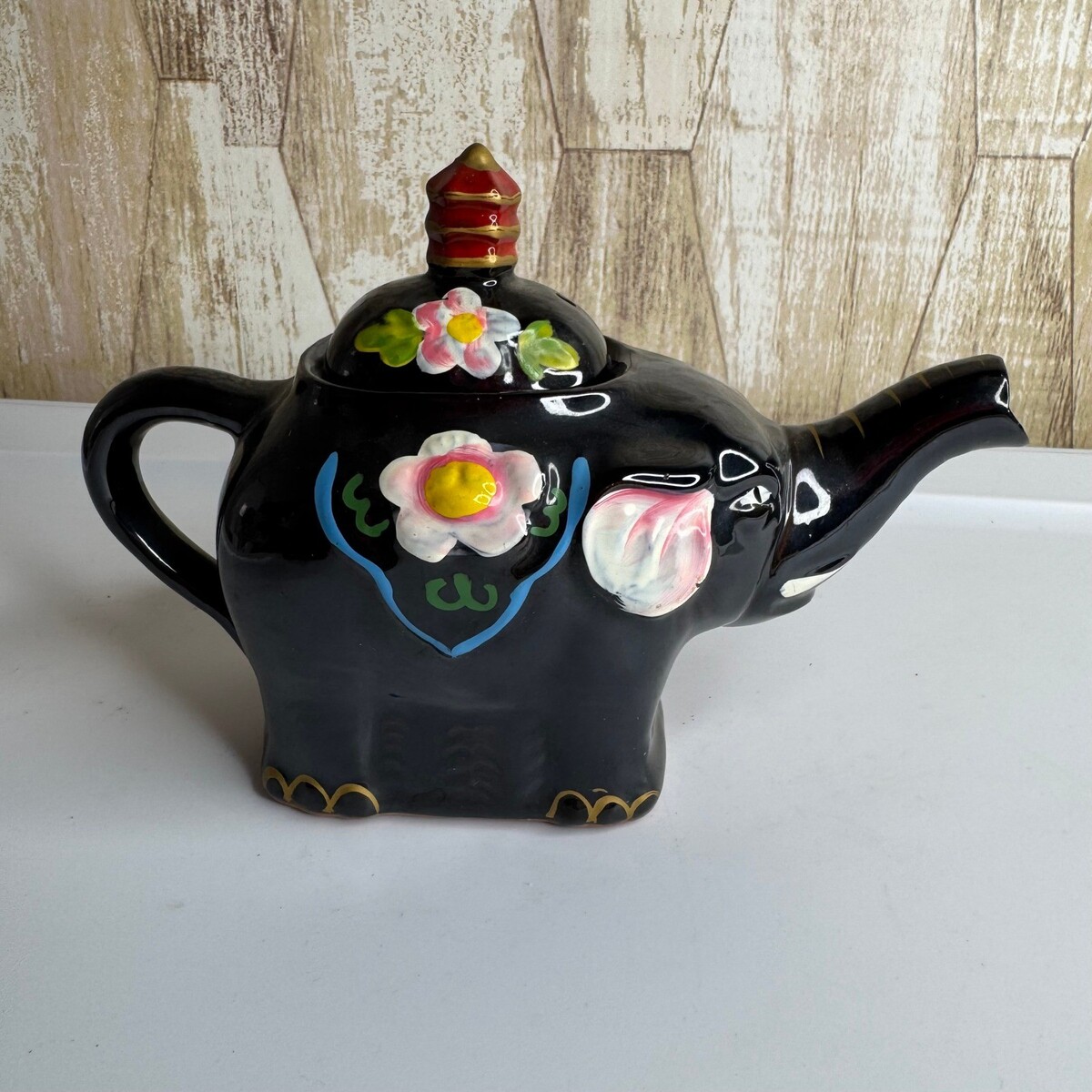 Keywords: ceramic teapot, elephant decor, novelty teapot, kitchenware, tableware, tea party, gift idea, whimsical, decorative, collectible, Asian inspired, hand painted, floral accent
