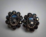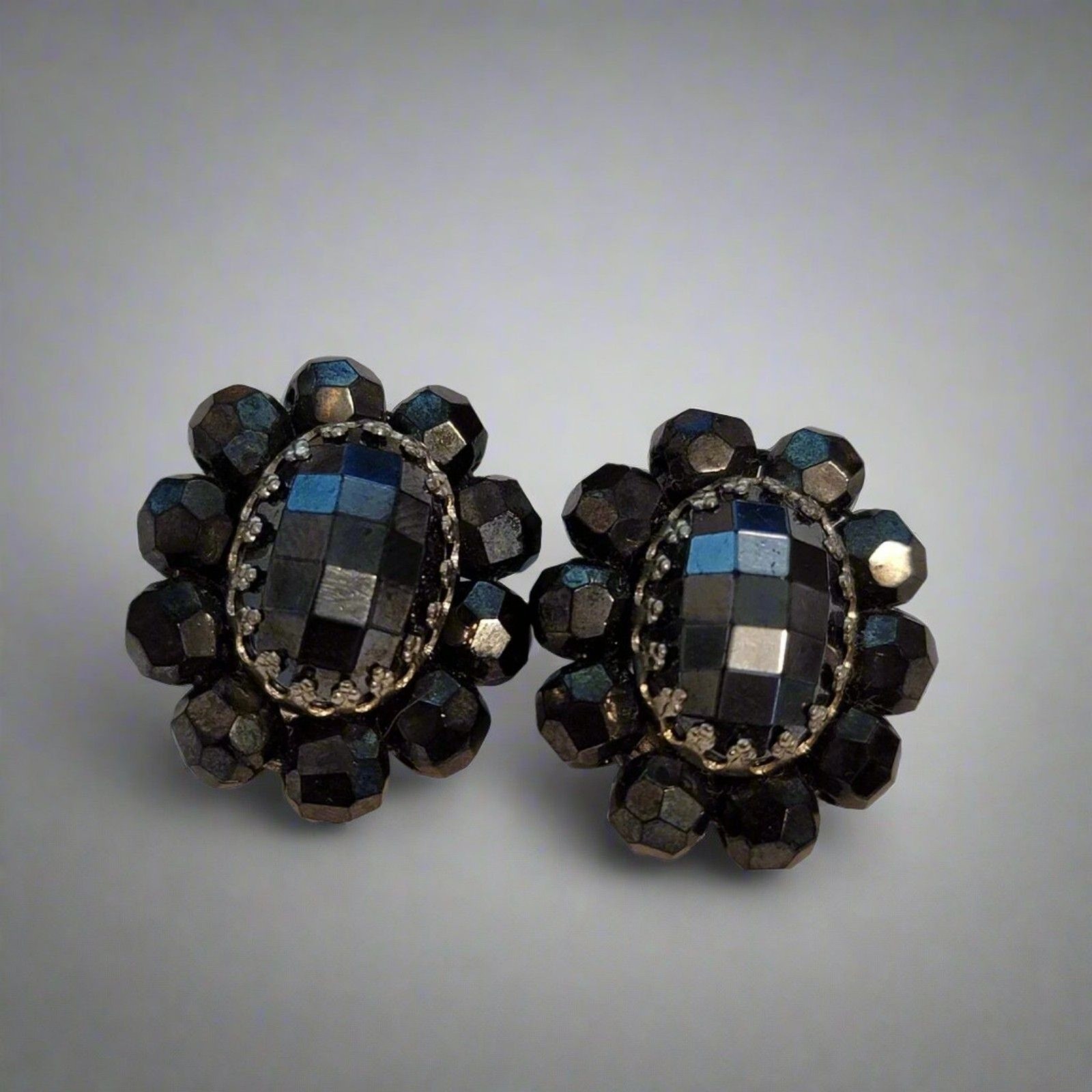These vintage black faceted bead clip-on earrings feature a bold button-style design with a sparkling faceted oval center surrounded by faceted round beads. The reflective cut of the beads catches the light beautifully, making them perfect for both day and evening wear. Classic and versatile, these earrings bring timeless mid-century elegance to any jewelry collection.