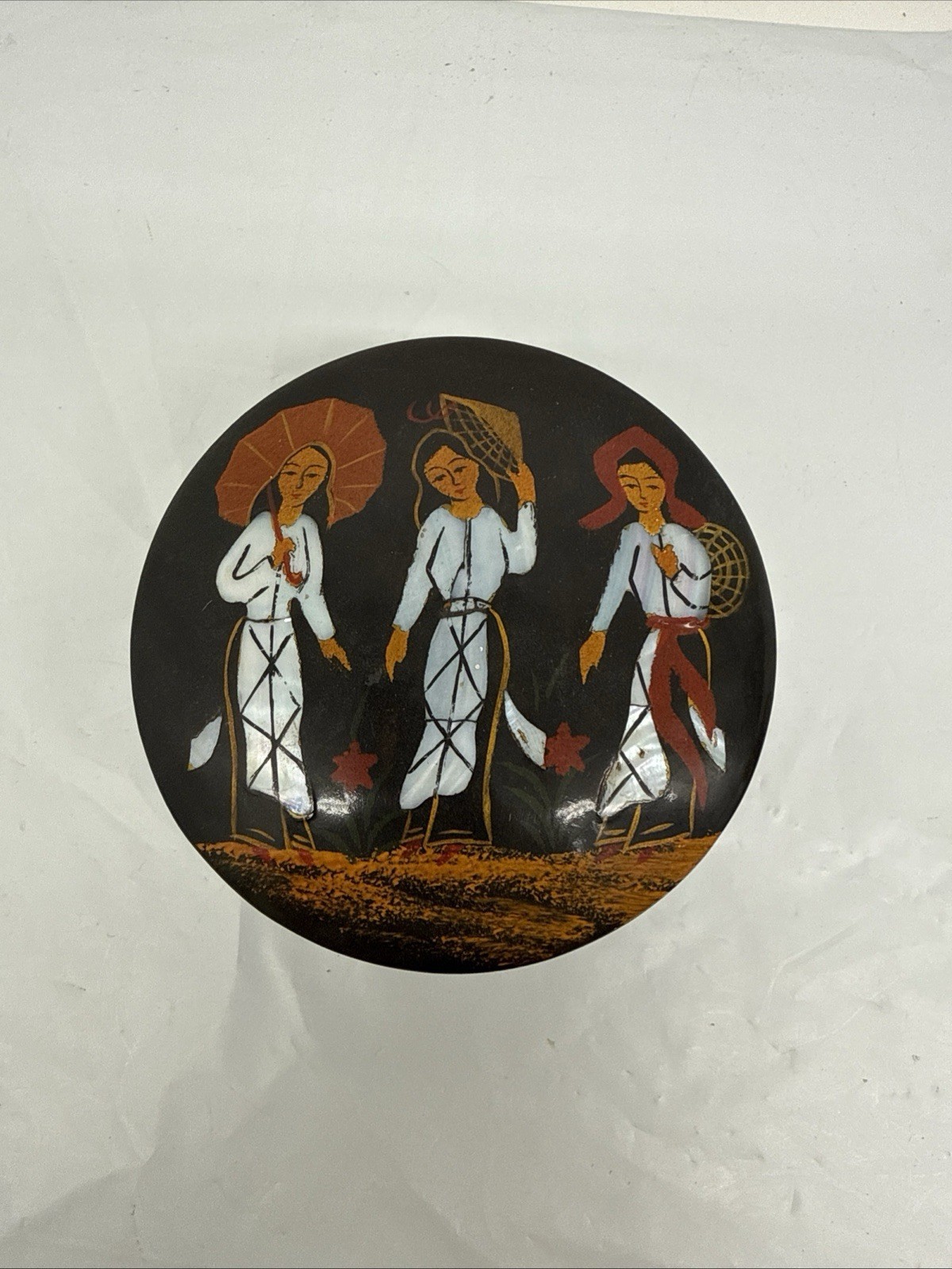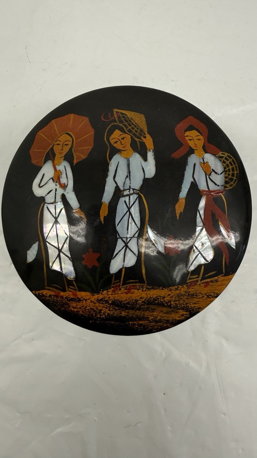 - Vintage Black Lacquer Plate Asian women with hats and umbrella