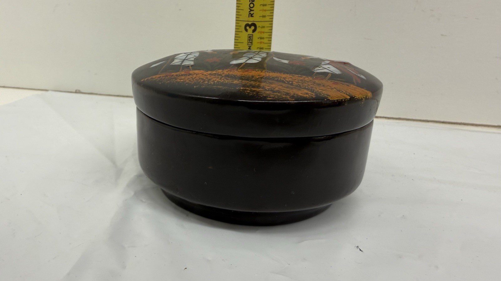 This Vintage Black Lacquer Plate featuring Asian women with hats and umbrella is a unique collectible piece that showcases Japanese culture. With a provenance of ownership history available, this plate is a representation of traditional Japanese artistry and craftsmanship. The intricate design and attention to detail make it a standout piece for collectors interested in Asian cultures and ethnicities. This plate is a beautiful addition to any collection focusing on Japanese art and heritage.