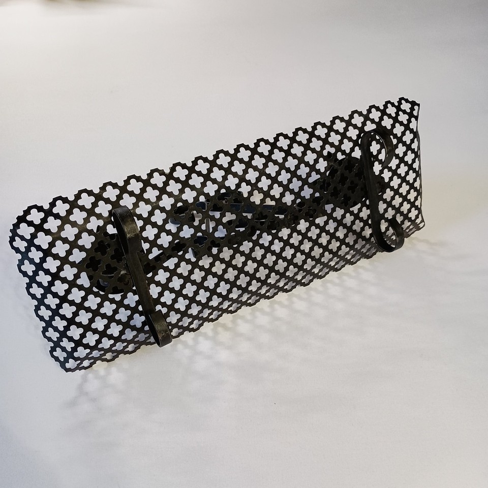 This Vintage Black Metal Mesh Candlestick Holder is a unique and stylish piece perfect for adding a touch of retro charm to any space. Made of black metal with a mesh design, this mid-century modern centerpiece exudes a gothic vibe that will make a statement in any room. Its free-standing base allows for easy display and creates a dramatic focal point for your home decor. Ideal for collectors or those looking to add a distinctive touch to their living space, this vintage candlestick holder is both functional and decorative. Normal wear. All sizes are approximate.