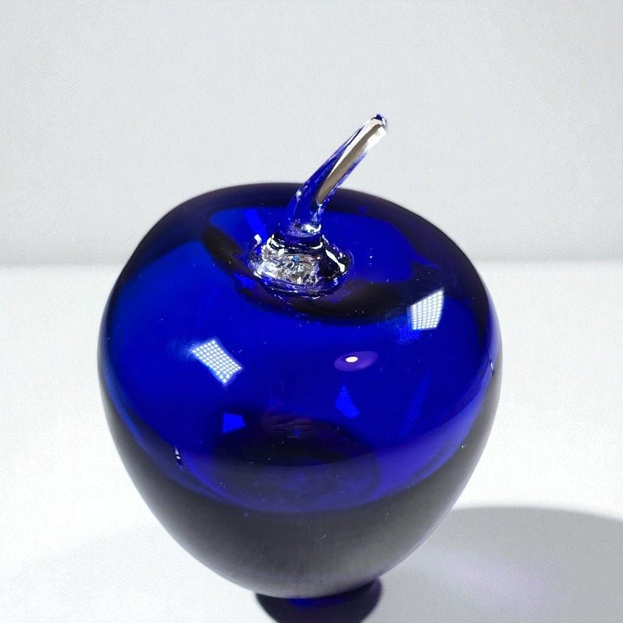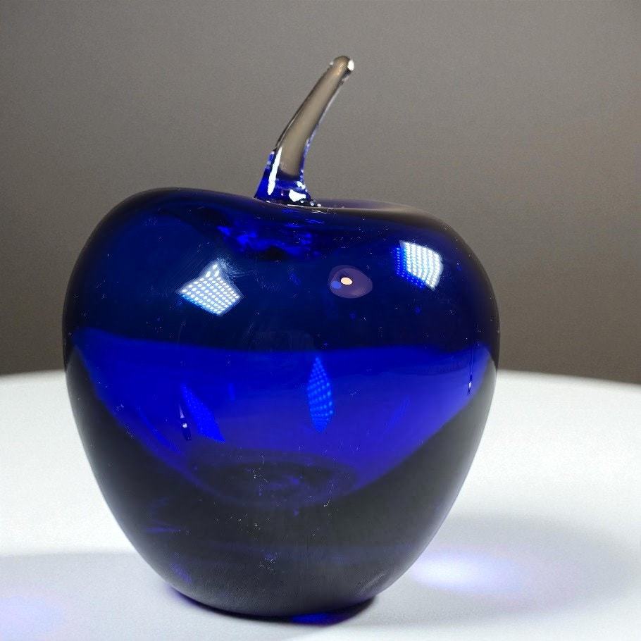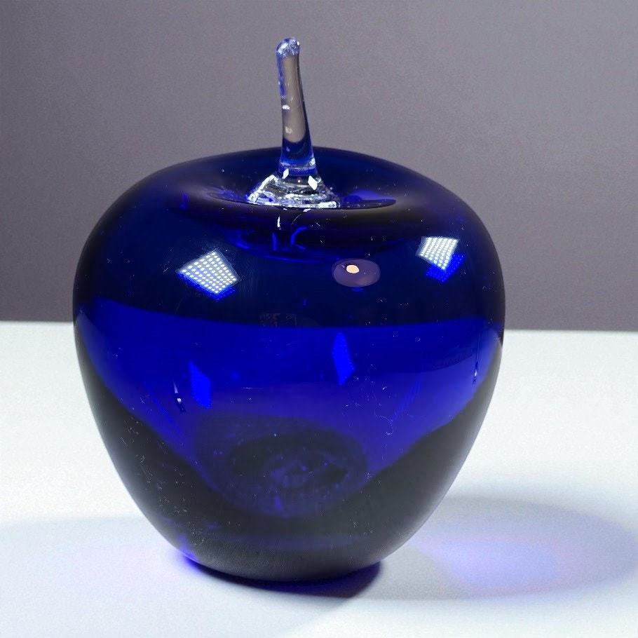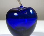 - Vintage Blenko Cobalt Blue Glass Apple Paperweight Clear Stem 4” Art Glass USA