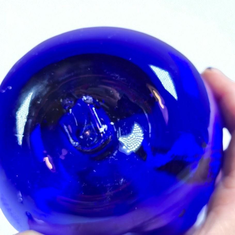 Vintage Blenko glass apple with deep cobalt blue body and clear glass stem