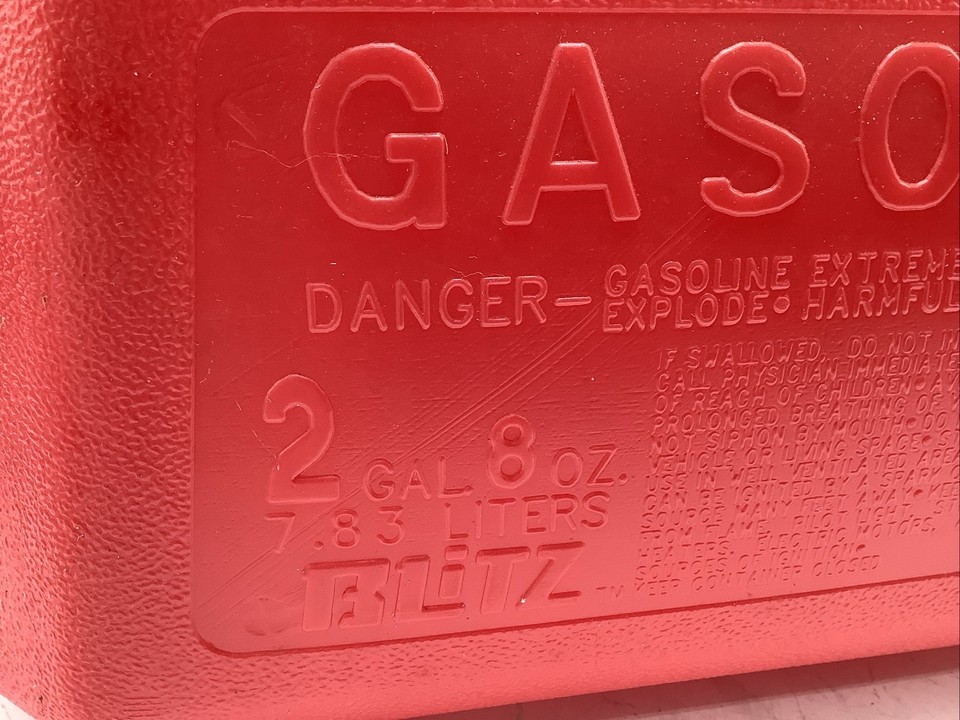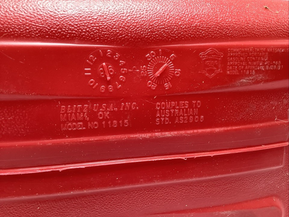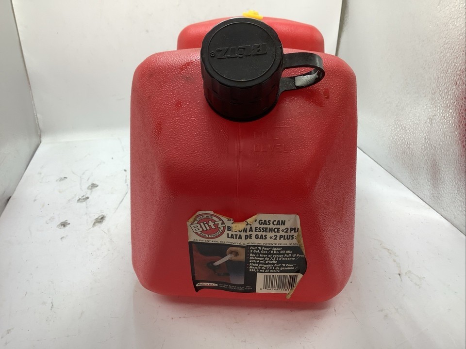 - Vintage Blitz 2 gallon 8 oz red plastic Vented Gas Can with Original Spout