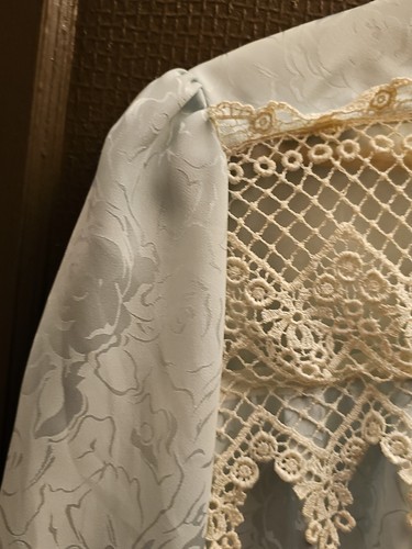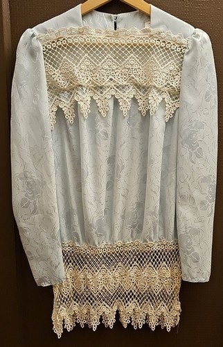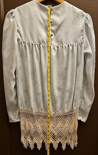 - Vintage Blue Jacquard Satin Lace Victorian Drop Waist Tunic Long Romantic Top