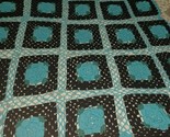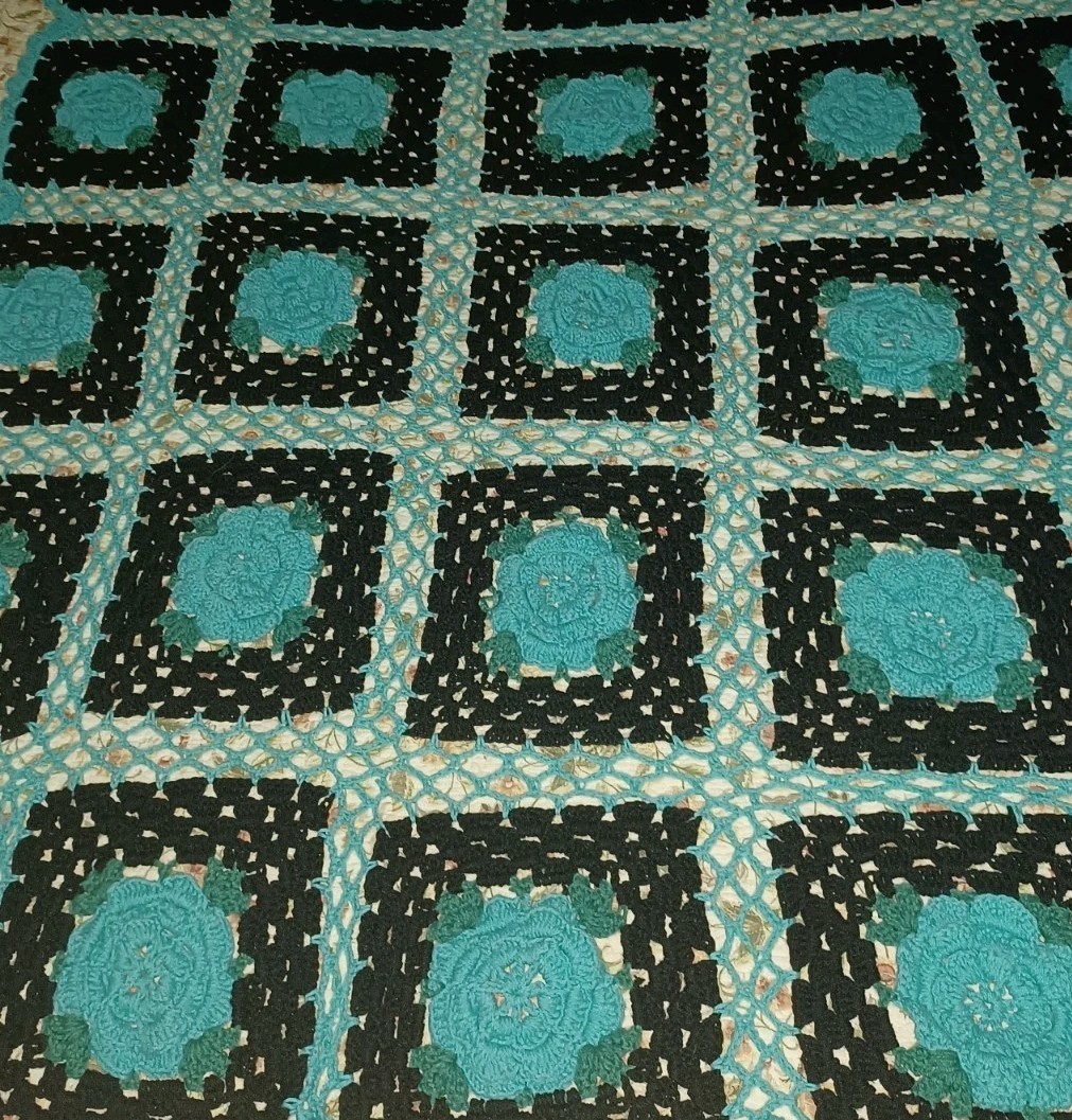 - Vintage Blue Rose Crocheted Granny Squares Blanket Afghan 93x 67" Black Teal