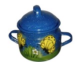 - Vintage Blue Speckled Enamelware Sugar Bowl Camping Farmhouse Painted Butterfly