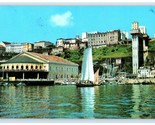 This vibrant vintage postcard showcases the bustling Mercado Modelo and the picturesque fisher-boats harbour in Salvador, Bahia, Brazil. The image captures a traditional sailboat gliding on the shimmering water with the iconic Lacerda Elevator and historic buildings rising on the hillside in the background. Printed using a lithographic process, the postcard features rich, vivid colors and a glossy chrome finish that highlights the tropical blue sky and the lively waterfront scene.