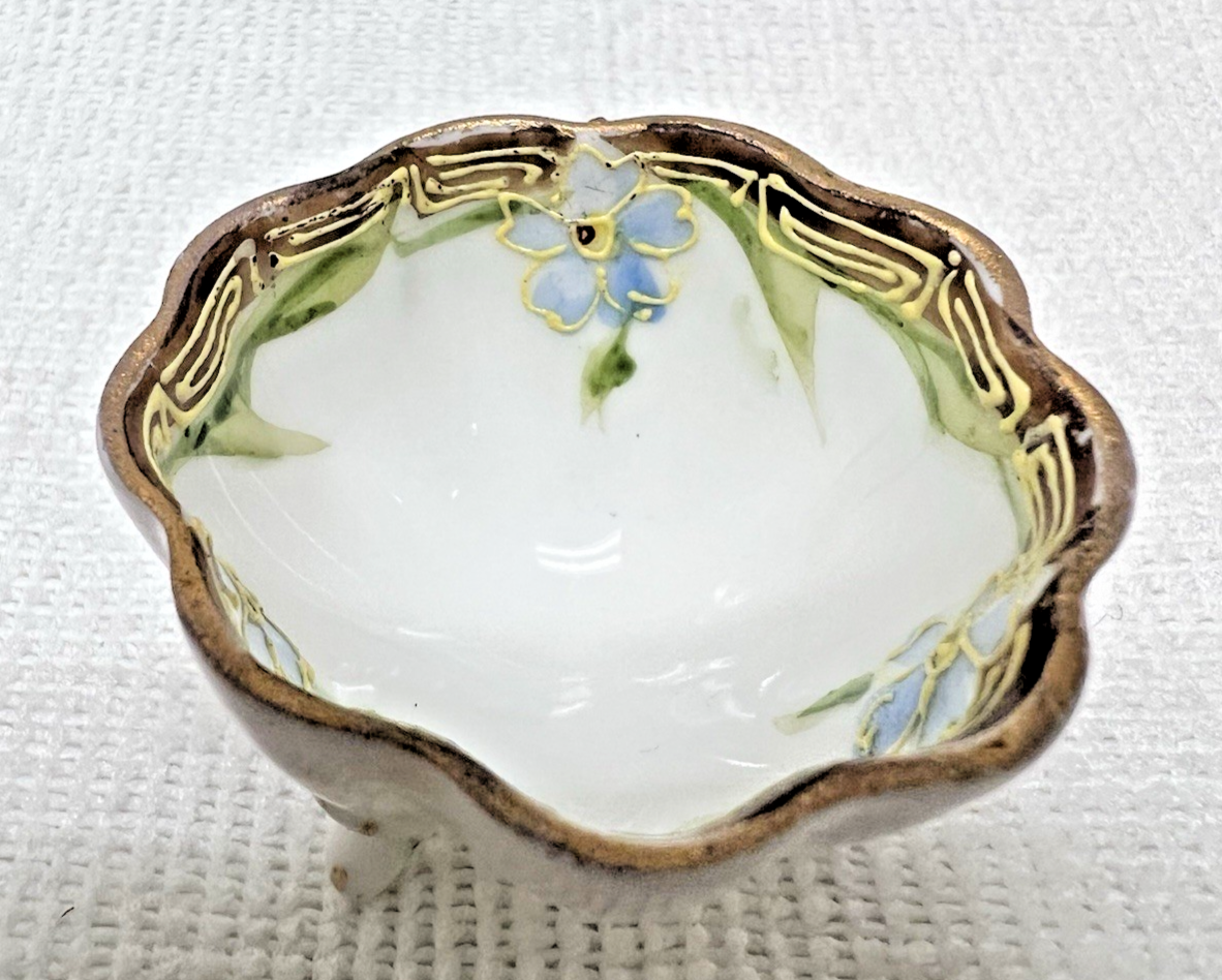 - Vintage Bone China Blue Floral w Moriage Ruffled Round Salt Dip w 3 Little Feet