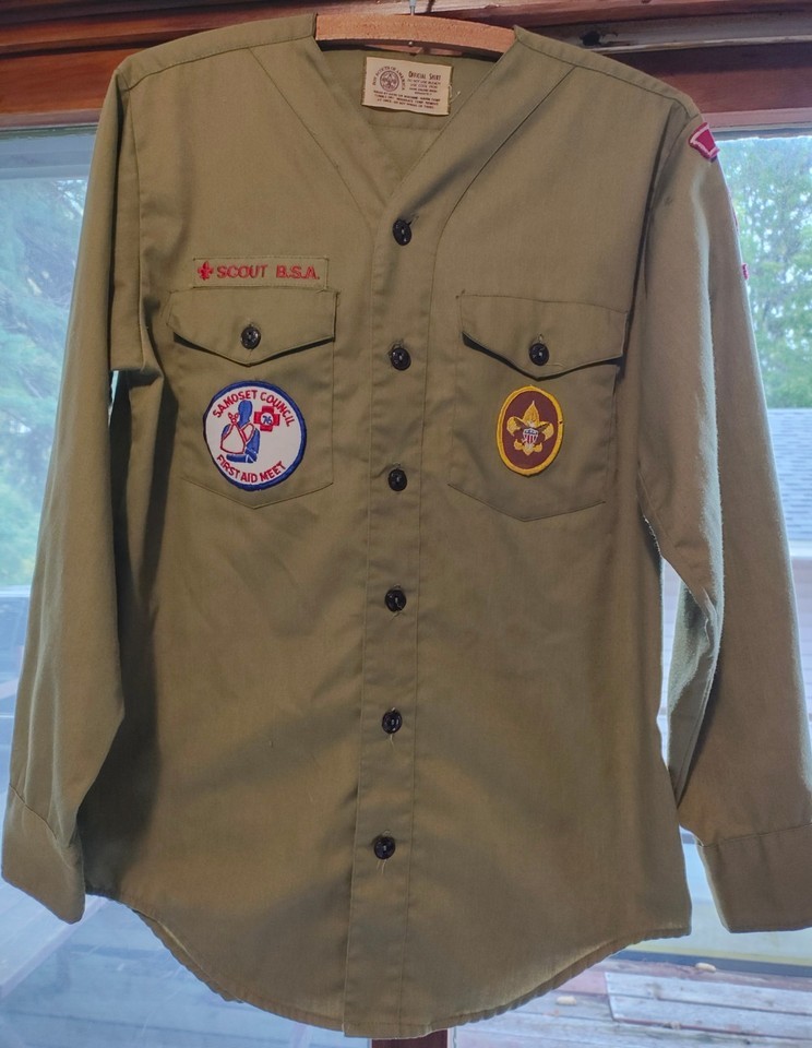 Vintage Boy Scouts Official Uniform Button Up Shirt Long sleeves W/ Patches