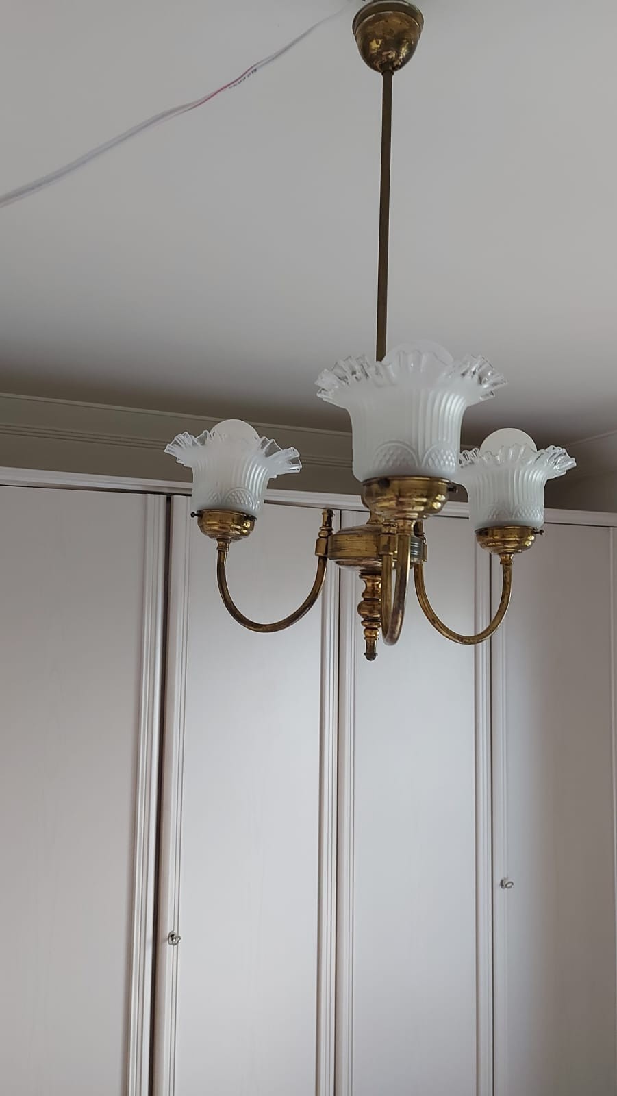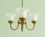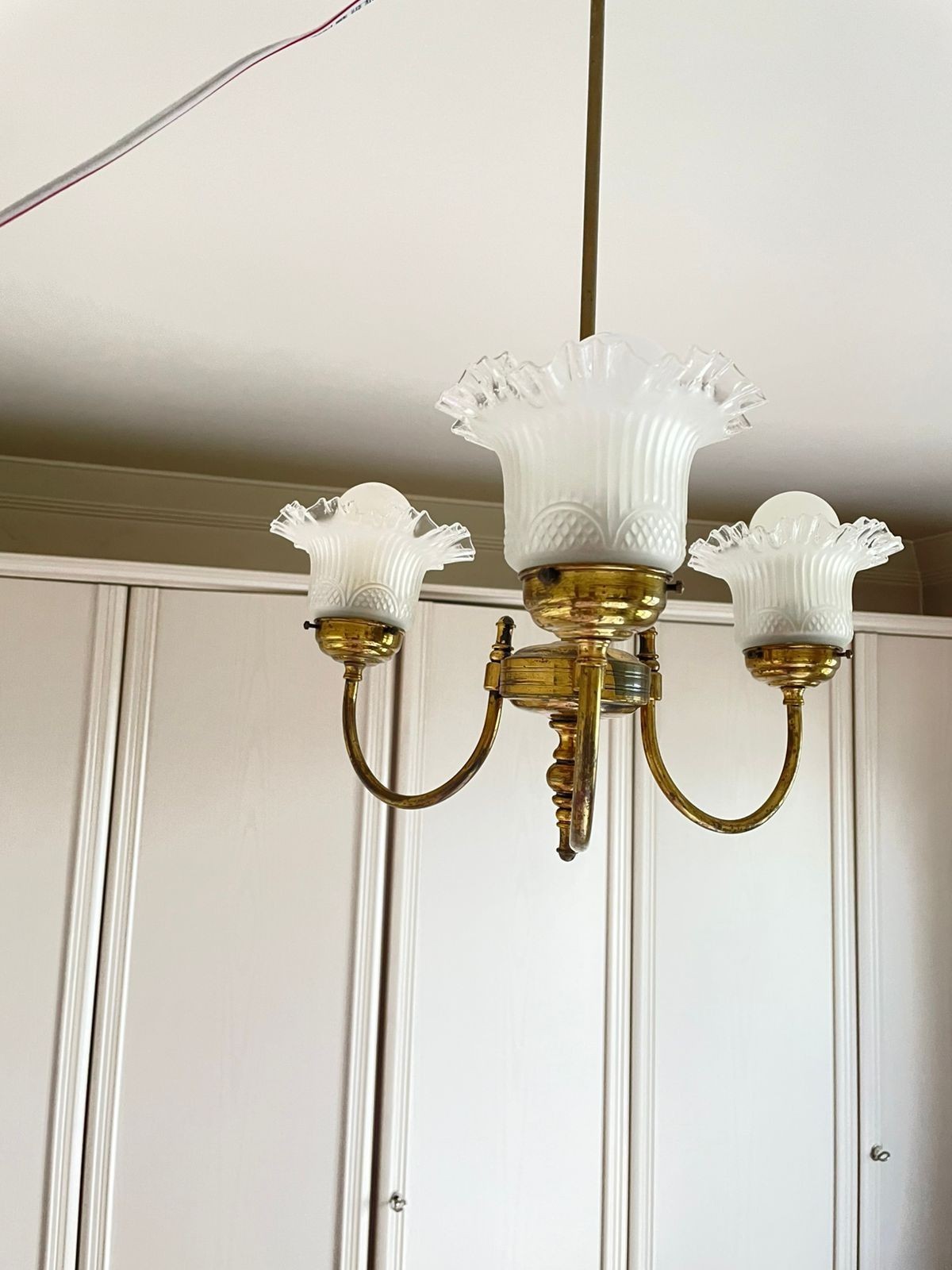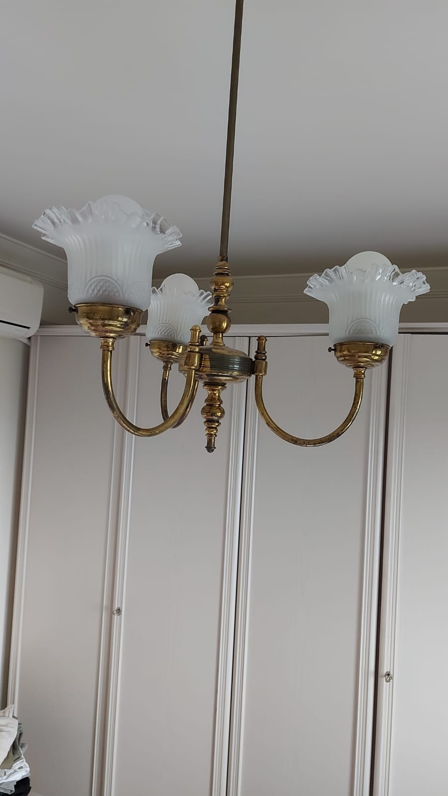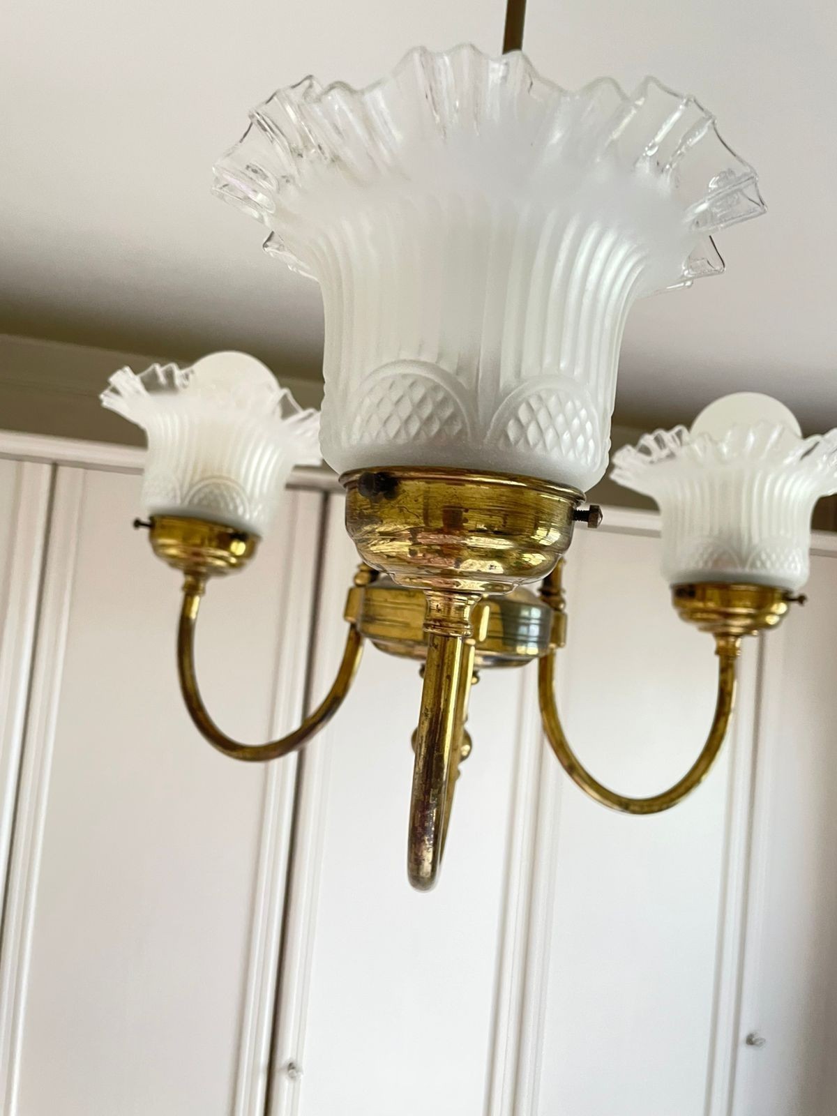 vintage brass chandelier, mid century ceiling light, frosted glass pendant, antique lighting fixture, 3 arm chandelier, brass home decor, retro ceiling lamp, vintage light fixture, tulip glass shade lamp, European chandelier, opal glass lighting, vintage interior decor, functional brass lamp, art deco style light