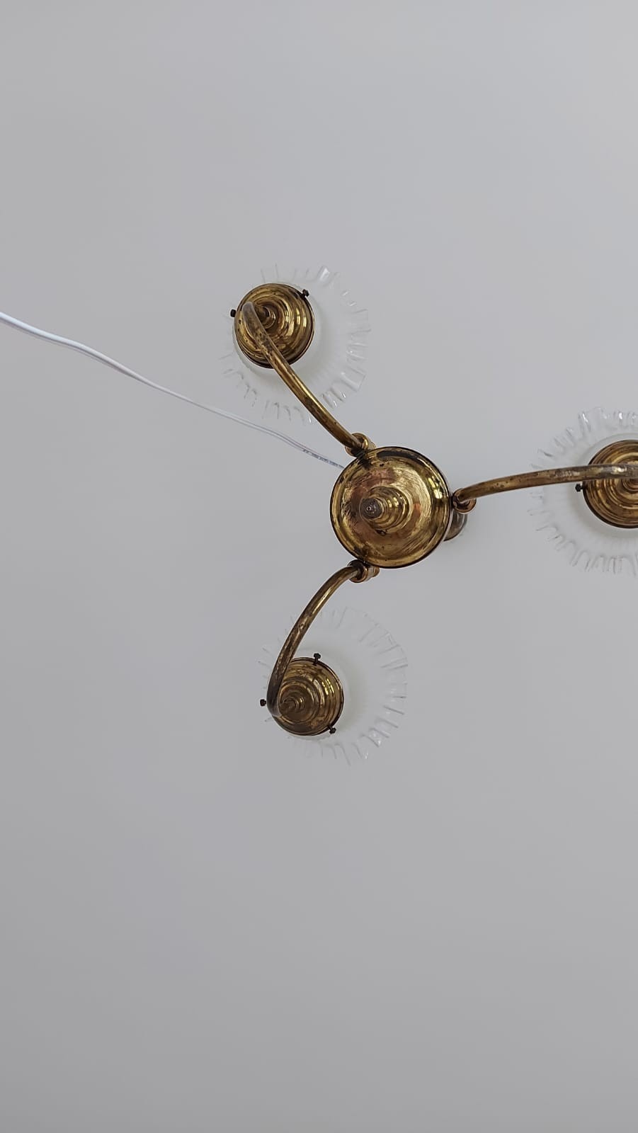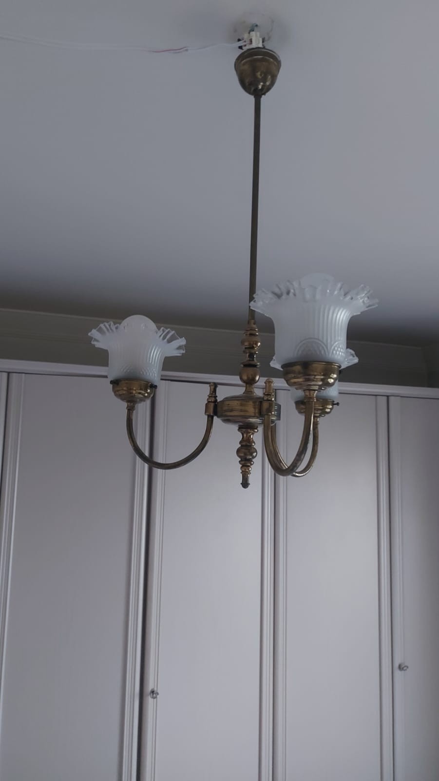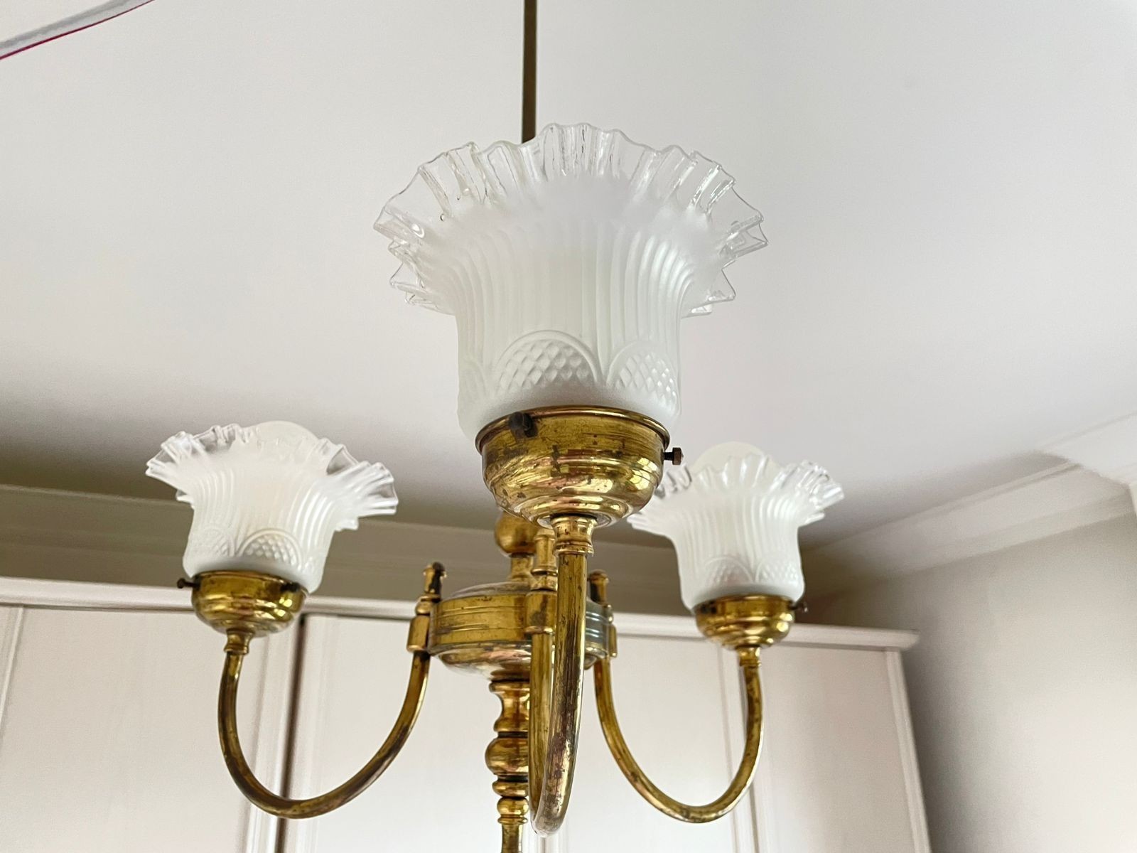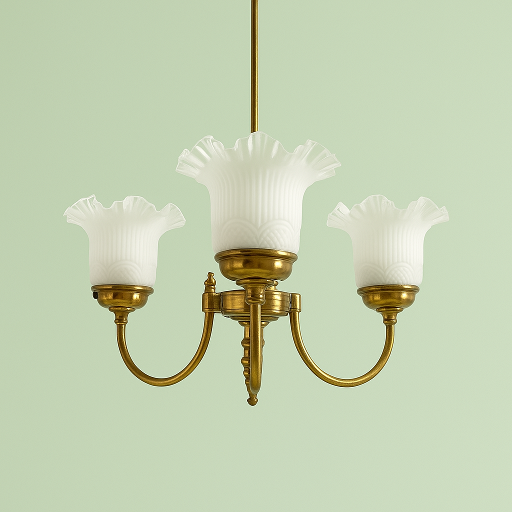 vintage brass chandelier, mid century ceiling light, frosted glass pendant, antique lighting fixture, 3 arm chandelier, brass home decor, retro ceiling lamp, vintage light fixture, tulip glass shade lamp, European chandelier, opal glass lighting, vintage interior decor, functional brass lamp, art deco style light