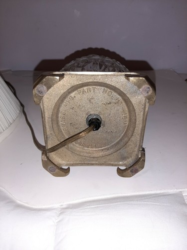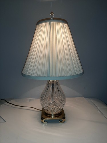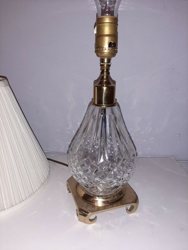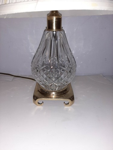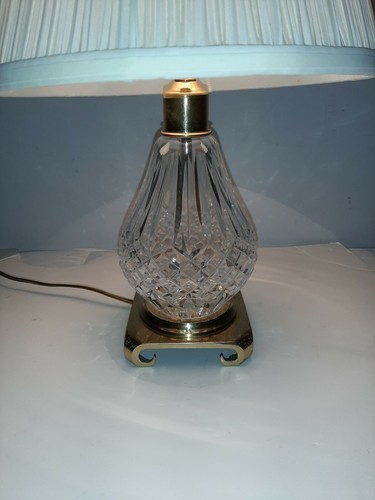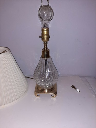VINTAGE BRASS AND WATERFORD CRYSTAL LAMP CRESCENT BRASS MANUFACTURING CO. This is the Maeve pattern with criss-cross cuts below and elogated cuts above the bell shape. The base is 9 inches tall to the bottom of the light bulb mechanism. The bottom of the base is 4.5 inches square. The shade is 8 inches tall without the finial.
