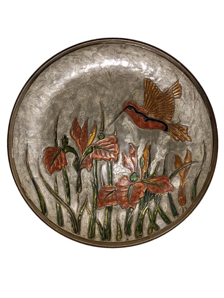 - Vintage Brass Enameled Decorative Humming Bird Lotus Flowers Plate Wall Hanging