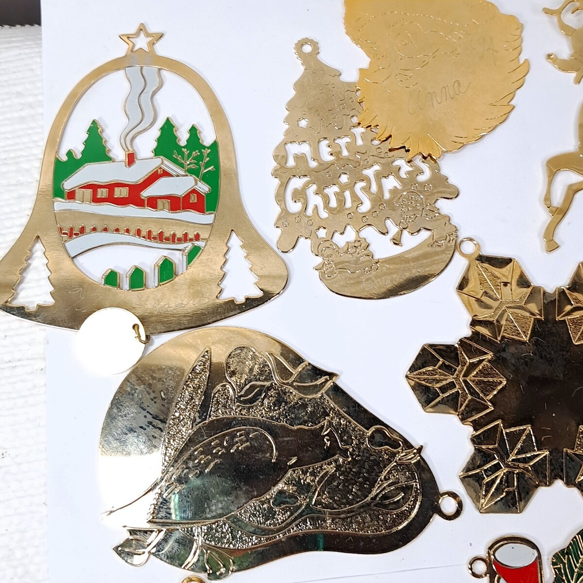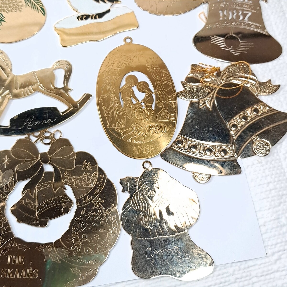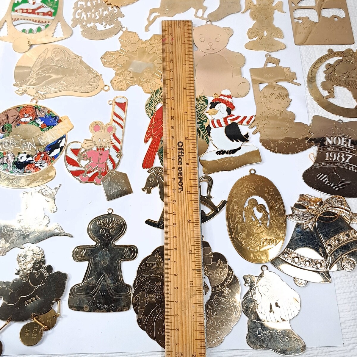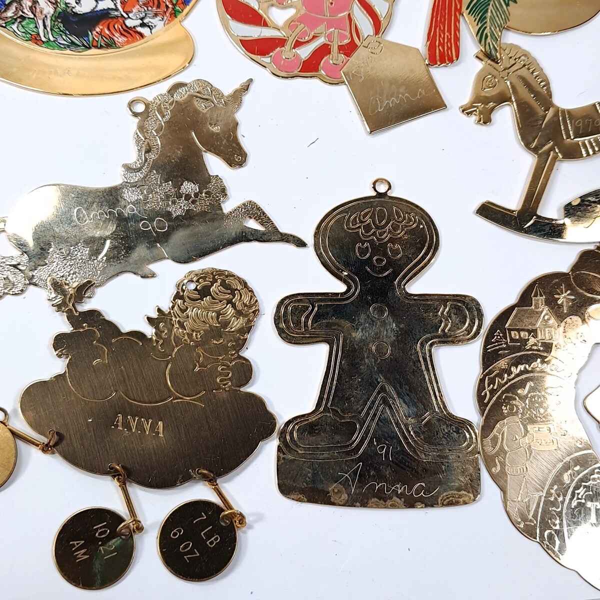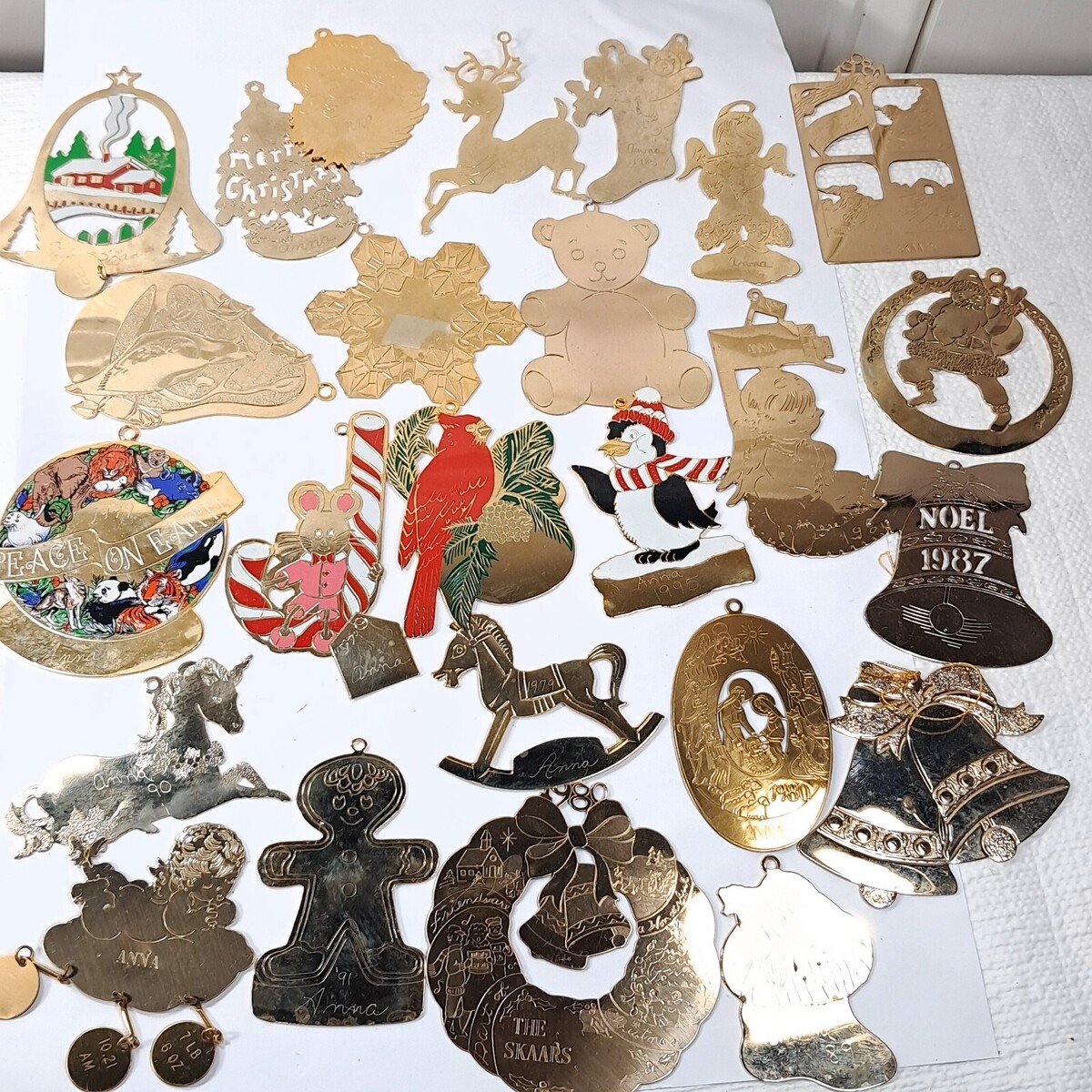 Includes 25 Christmas ornaments that are Gloria Duchin or Lillikins/ Lillian Vernon. Brass/gold tone metal. All are personalized. Scratches/wear as shown. Various dates and names on ornaments.