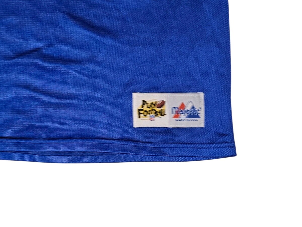 The Vintage Buffalo Bills Jersey is a classic piece of fan apparel perfect for any Buffalo Bills supporter. Made by Majestic and officially licensed by the National Football League (NFL), this jersey is a must-have for any fan looking to show their team pride. The blue color and size L make it a versatile option for men to wear during the regular season games. Made in the United States, this jersey is a timeless piece of football memorabilia that will never go out of style.