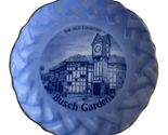 A charming vintage Busch Gardens souvenir plate featuring ?The Old Country? clock tower design in blue transferware style. The plate has a gently scalloped rim with a textured edge and metallic trim. A small red wire is attached to the back for hanging. Perfect for collectors of amusement park memorabilia or vintage travel souvenirs.