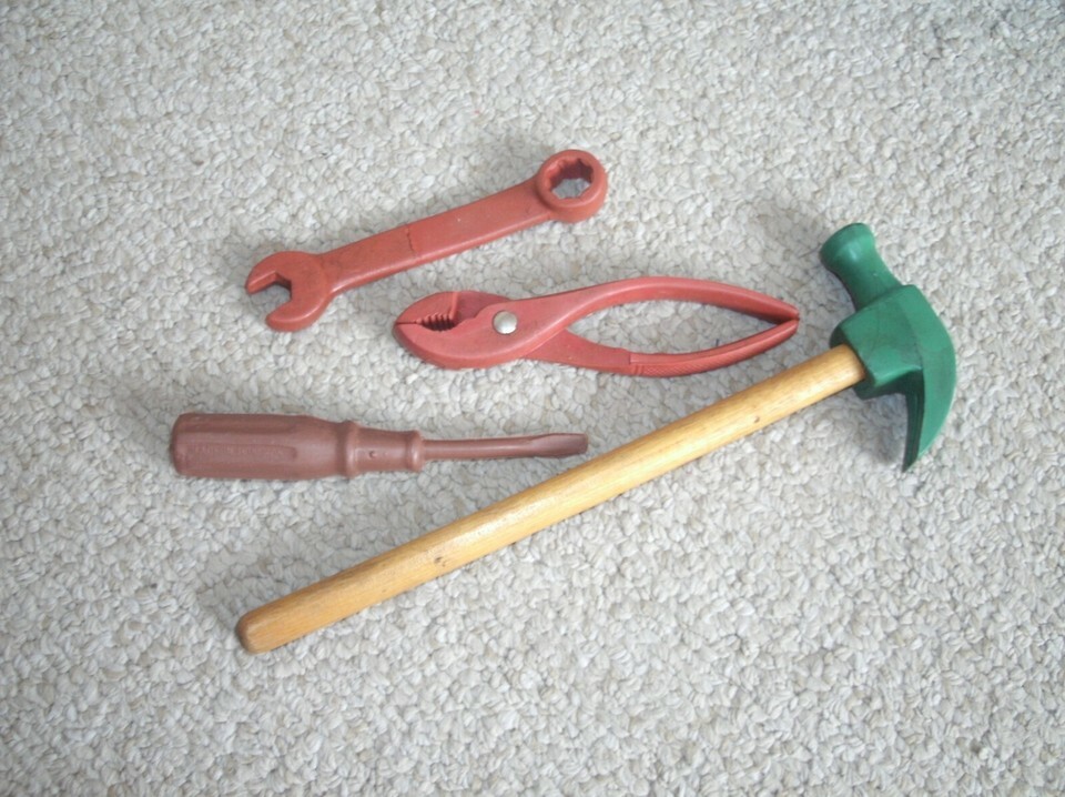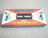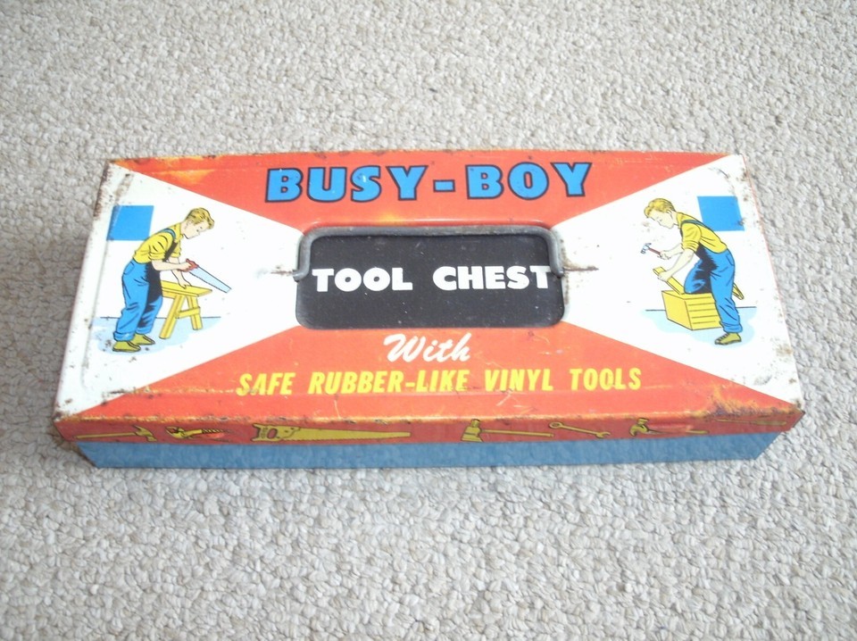 The Vintage Busy-Boy Tool Chest by Ohio Art is a tin toy from the United States. This vintage toy set includes various tools and is a nostalgic piece of Americana. There are four tools that come with the box. There is some rust on the tool chest, look at pictures.