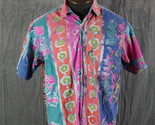 Up for sale is a vintage grunge button shirt. It is a button-down short sleeve with a tie-dye pattern done in blue, green, red and pink. Throughout the shirt are various tribal patterns done in vertical stripes. What a great shirt do not miss out on it.