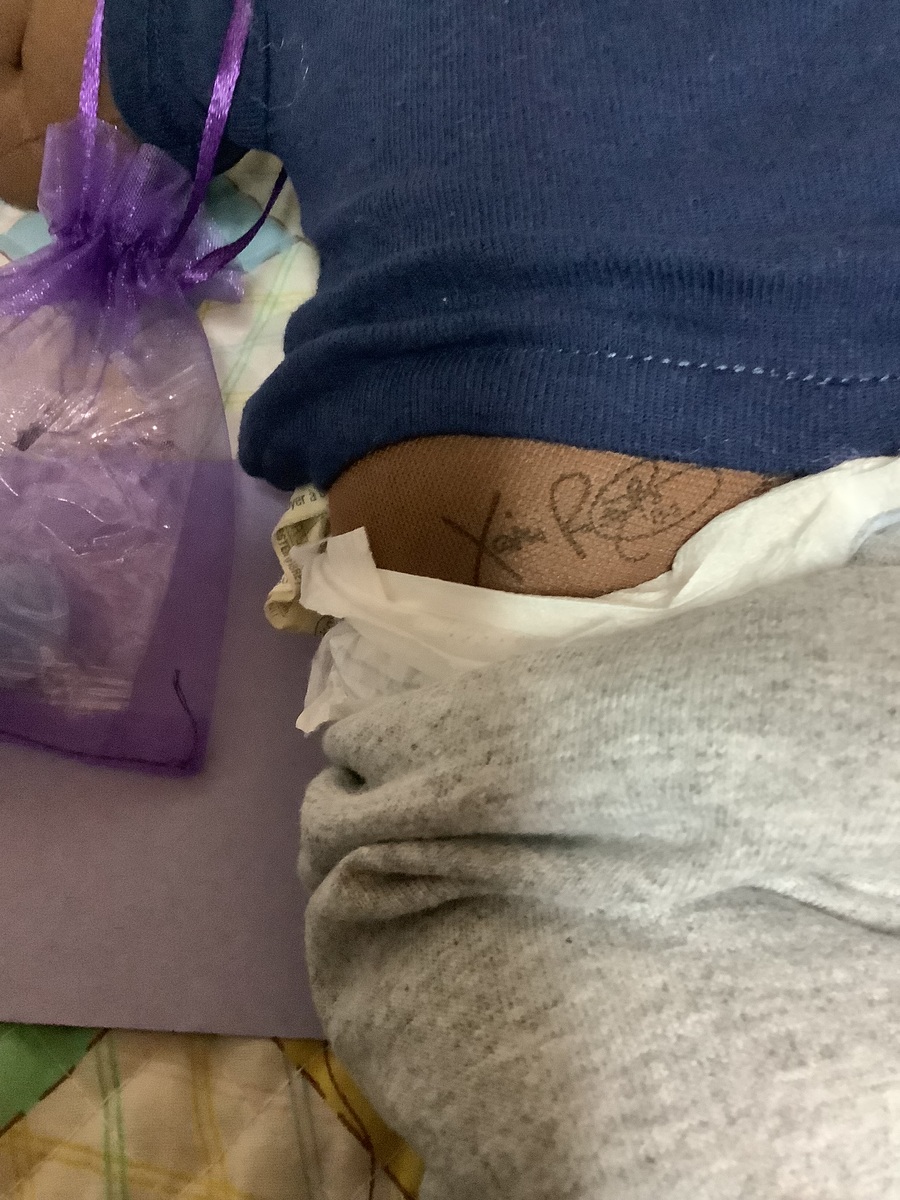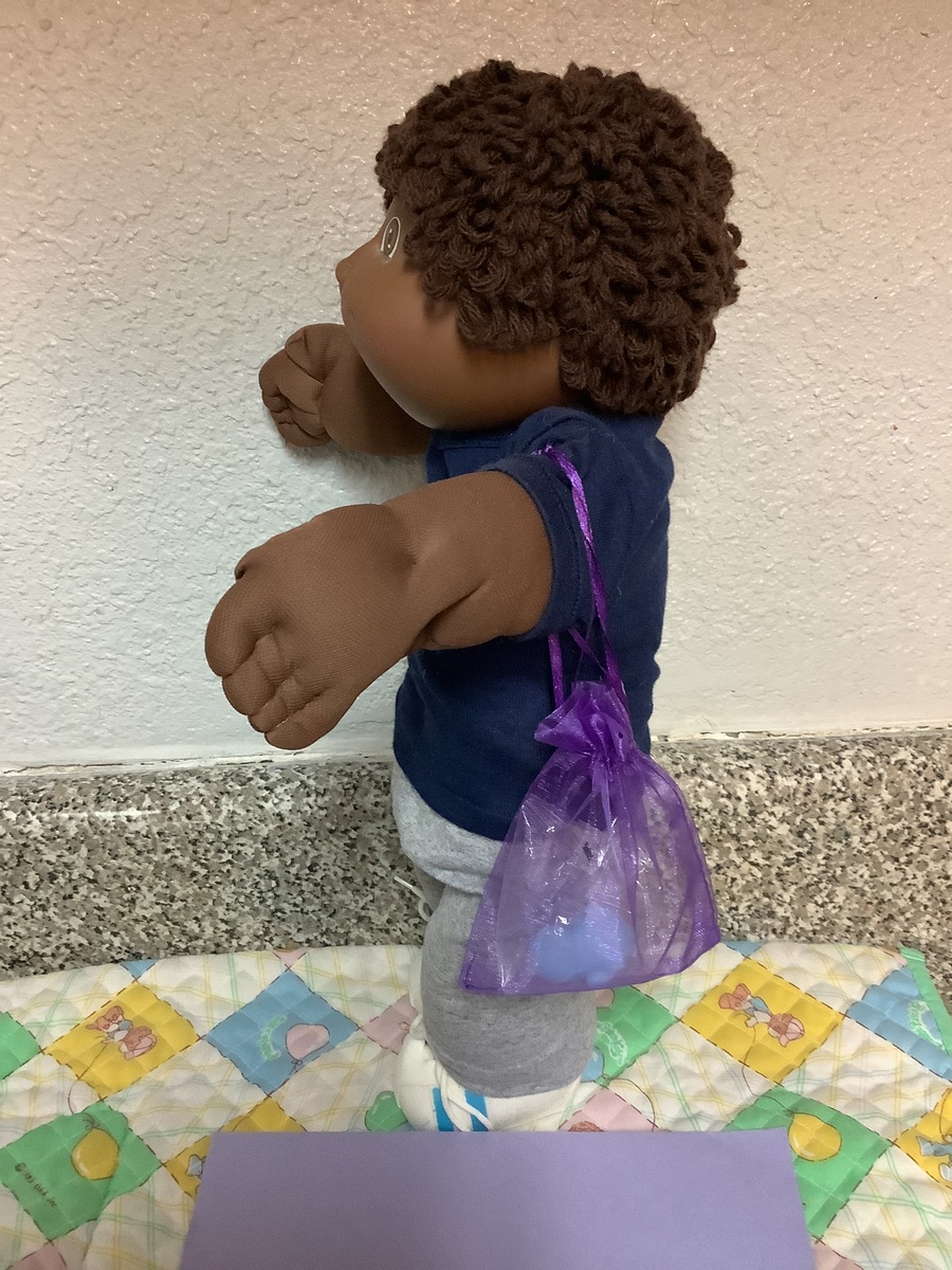 He comes with custom made adoption papers just because……I call him Nolan Aaron but please feel free to give him the name of your choice. He also comes with a little gift.