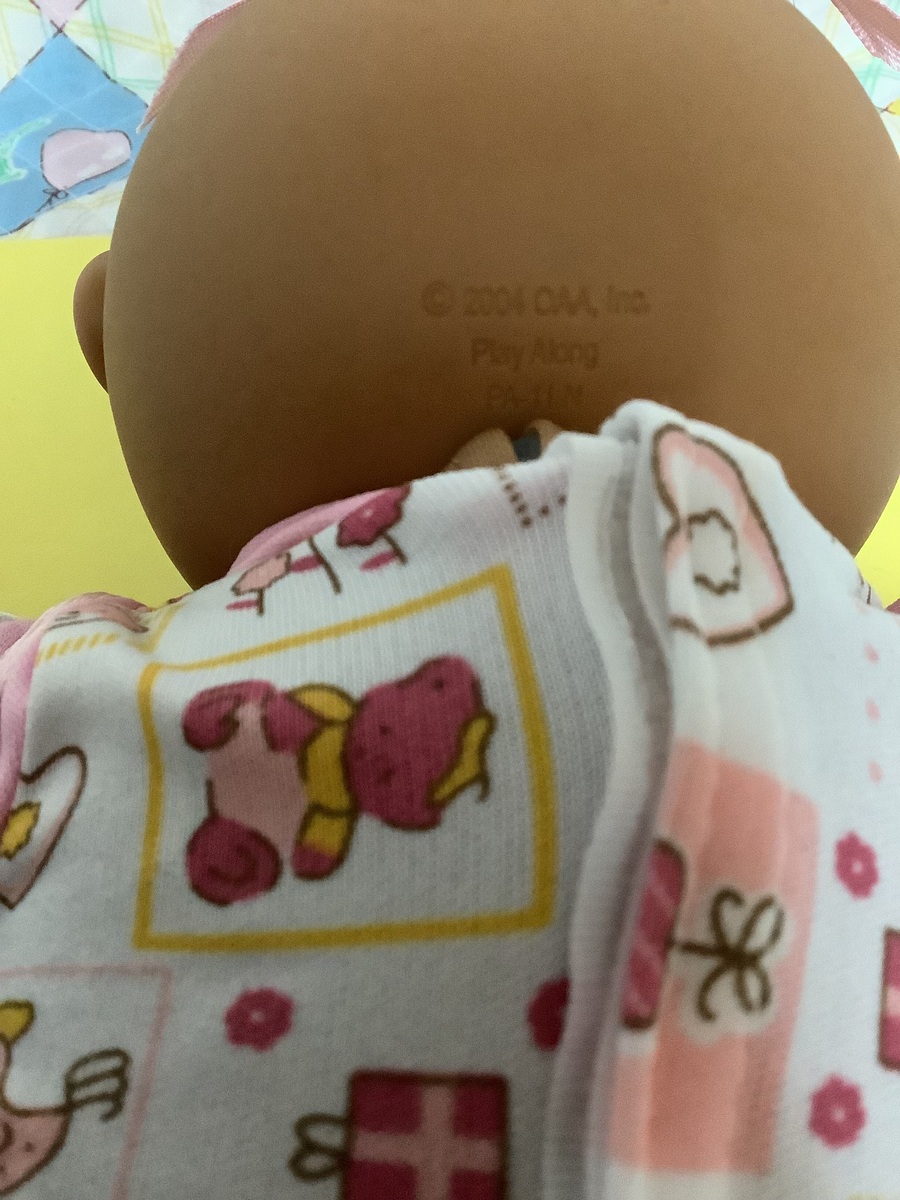This little baby girl is absolutely adorable with her brown tuft of curly hair and pretty brown eyes. She is an African American Play Along baby girl-a PA-11N from 2004 to be exact. Her side tag is still intact and so is her signature. She is approximately 11 inches tall. She is wearing a BRAND NEW outfit and socks. She is in very good vintage condition for her age of exactly 21-almost 22 but please bear in mind that she is still a vintage item-not new and therefore not perfect but she has definitely been restored. She can even stand by herself!! How cute is that??Please see all pics as they are part of the description. She comes from my smoke free home although I am not her original owner. Sold AS IS.