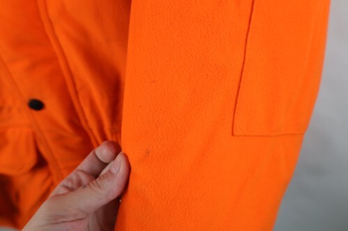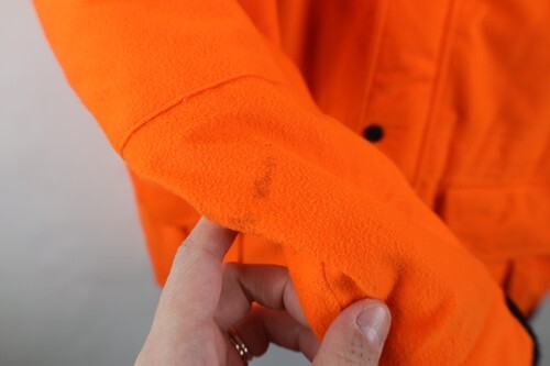 Stains throughout, cuffs, hood, inner lining. Material stuck to inner lining. Hood, cuffs discolored. Color faded. Pilling