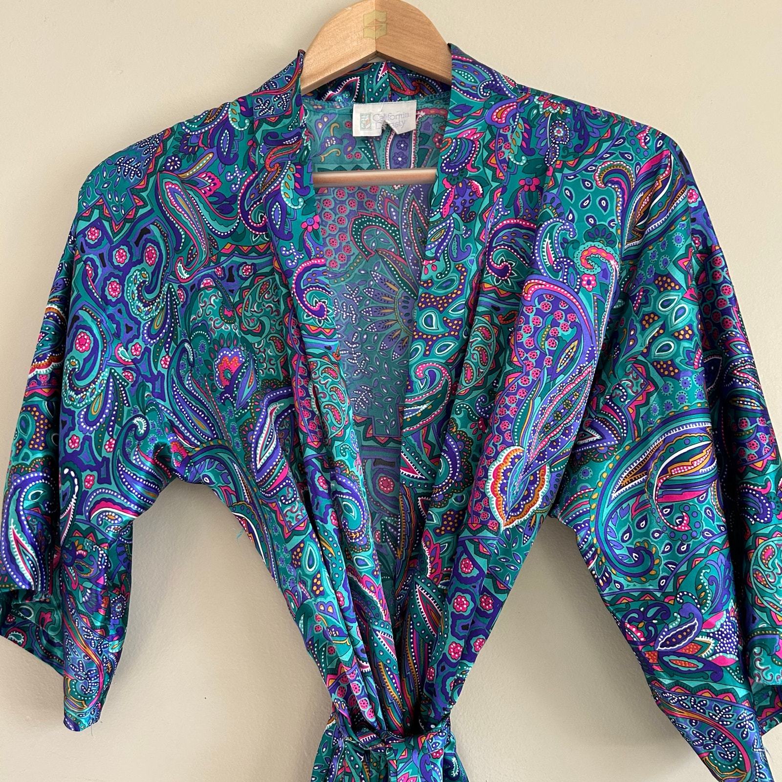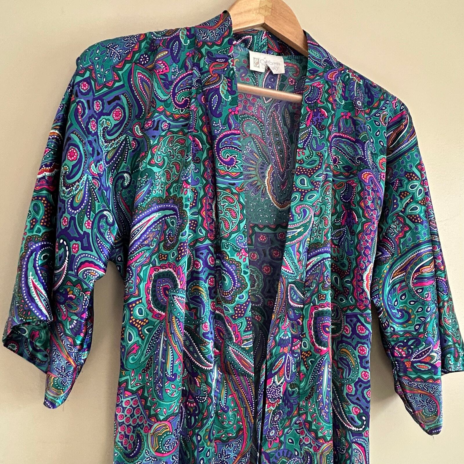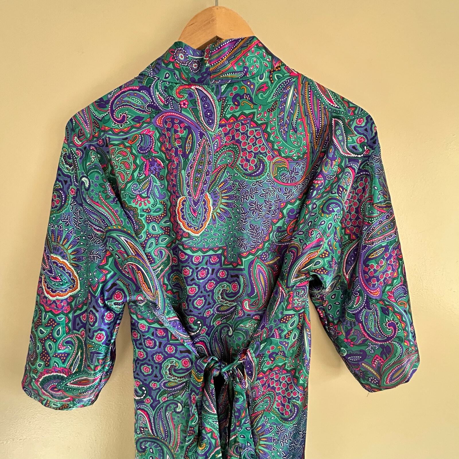 Vintage California Dynasty satiny robe in a bold paisley print of jewel tones (teal, purple, pink, and emerald green). Lightweight and silky feel with a matching tie belt.