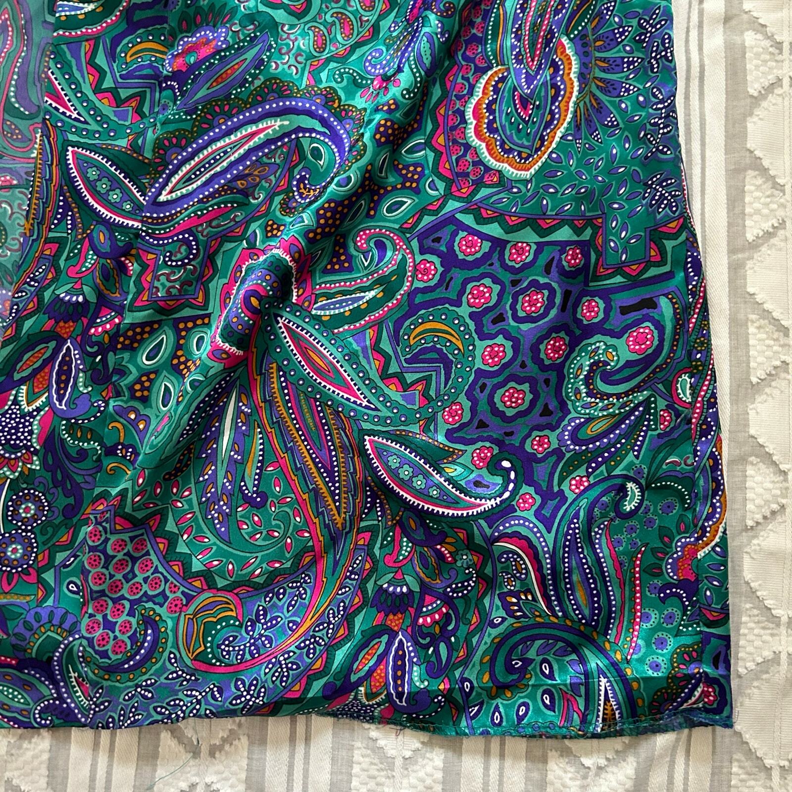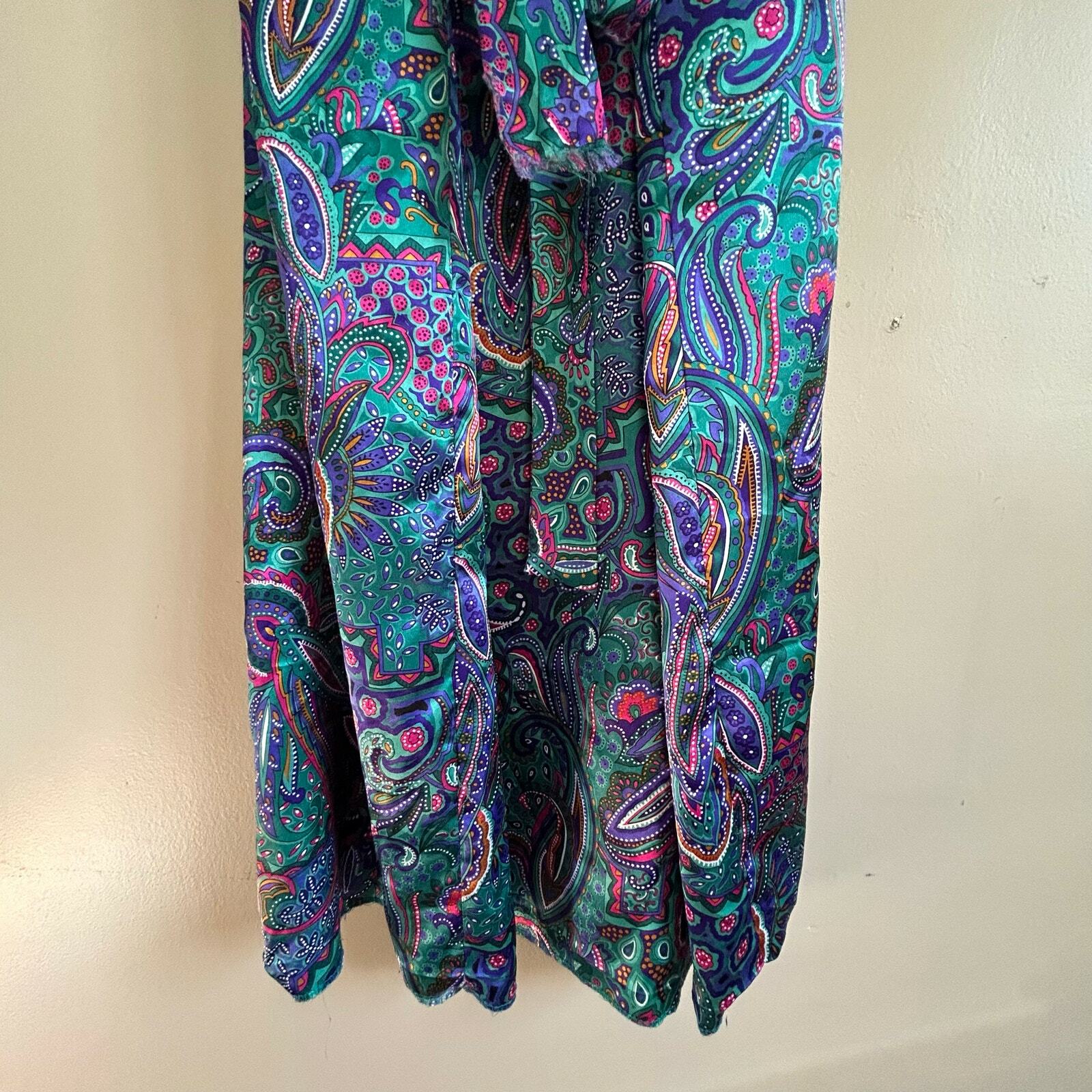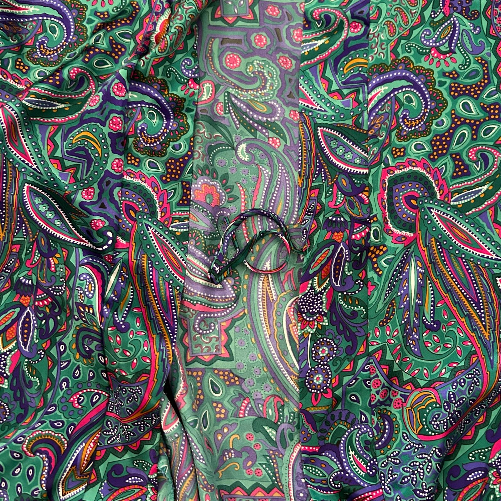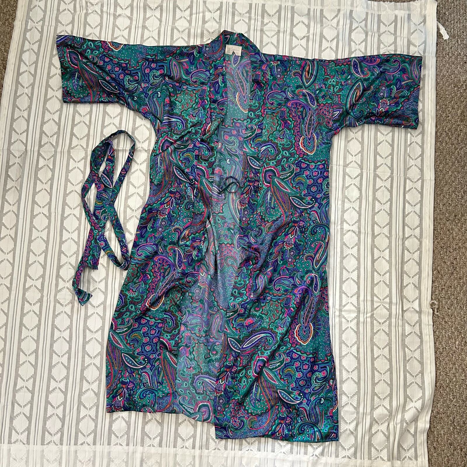 Vintage California Dynasty satiny robe in a bold paisley print of jewel tones (teal, purple, pink, and emerald green). Lightweight and silky feel with a matching tie belt.