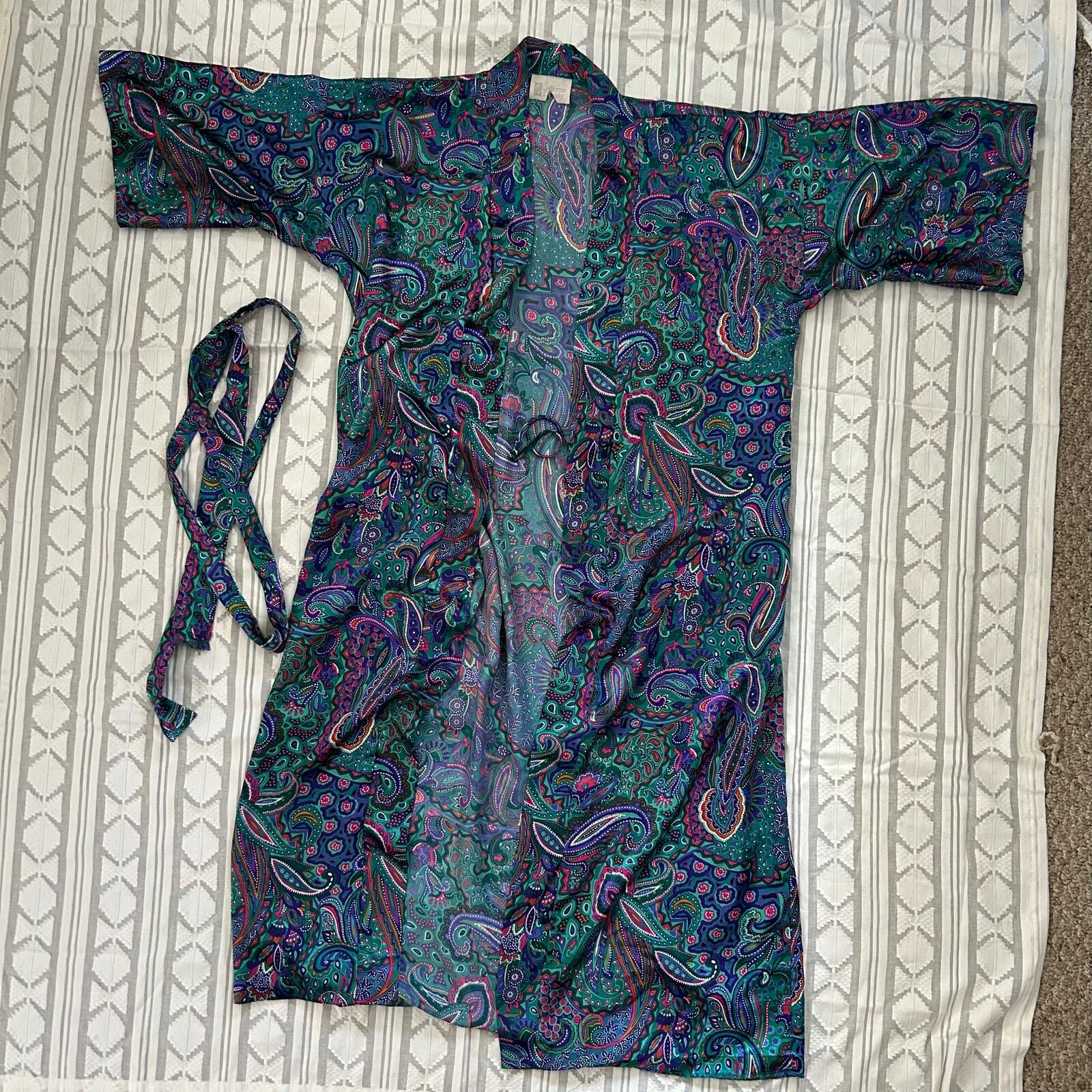 vintage robe, california dynasty, paisley print, satiny robe, silky robe, jewel tone robe, 80s robe, 90s robe, lounge robe, boho robe, festival robe, belted robe, women?s small, pajama robe, dressing gown, glam robe, colorful robe, sleepwear, vintage lingerie, loungewear