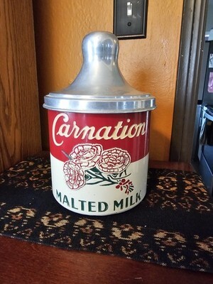 Authentic 1930s?1940s Carnation Malted Milk counter canister ? used in old soda fountains and drugstore counters.