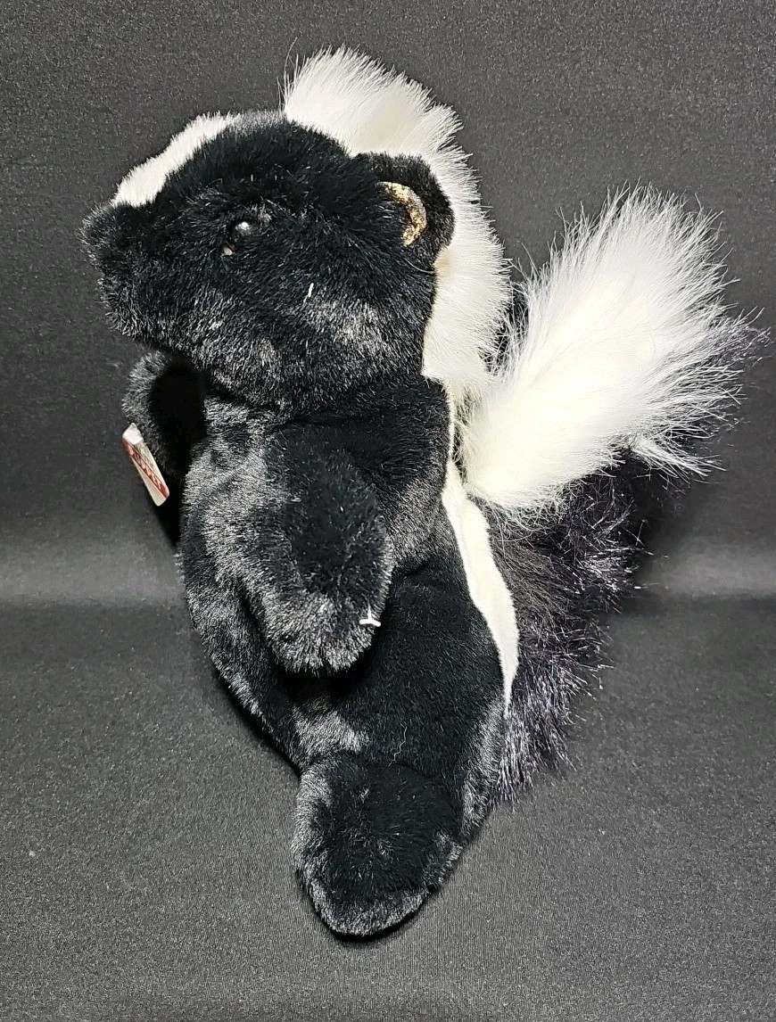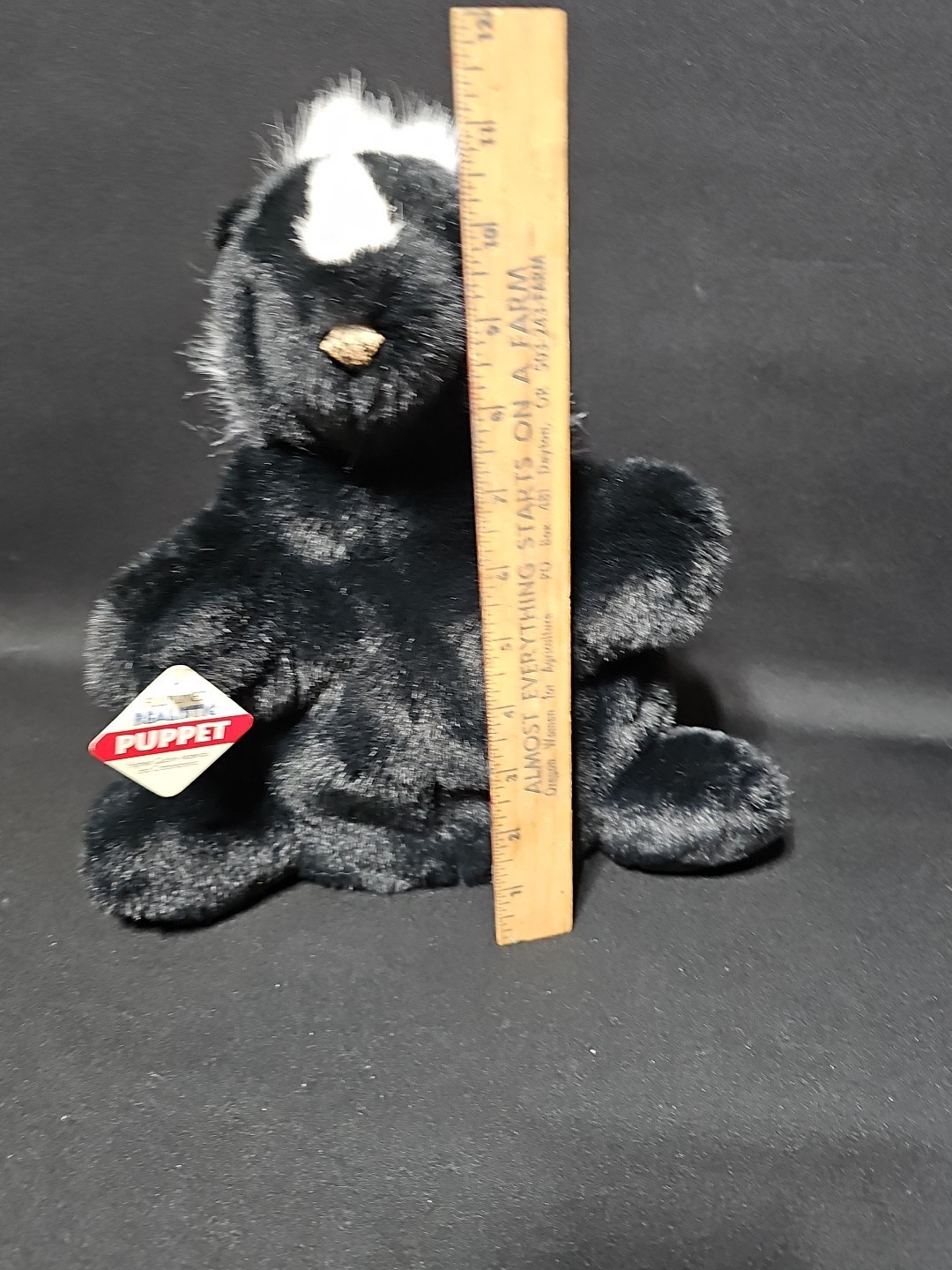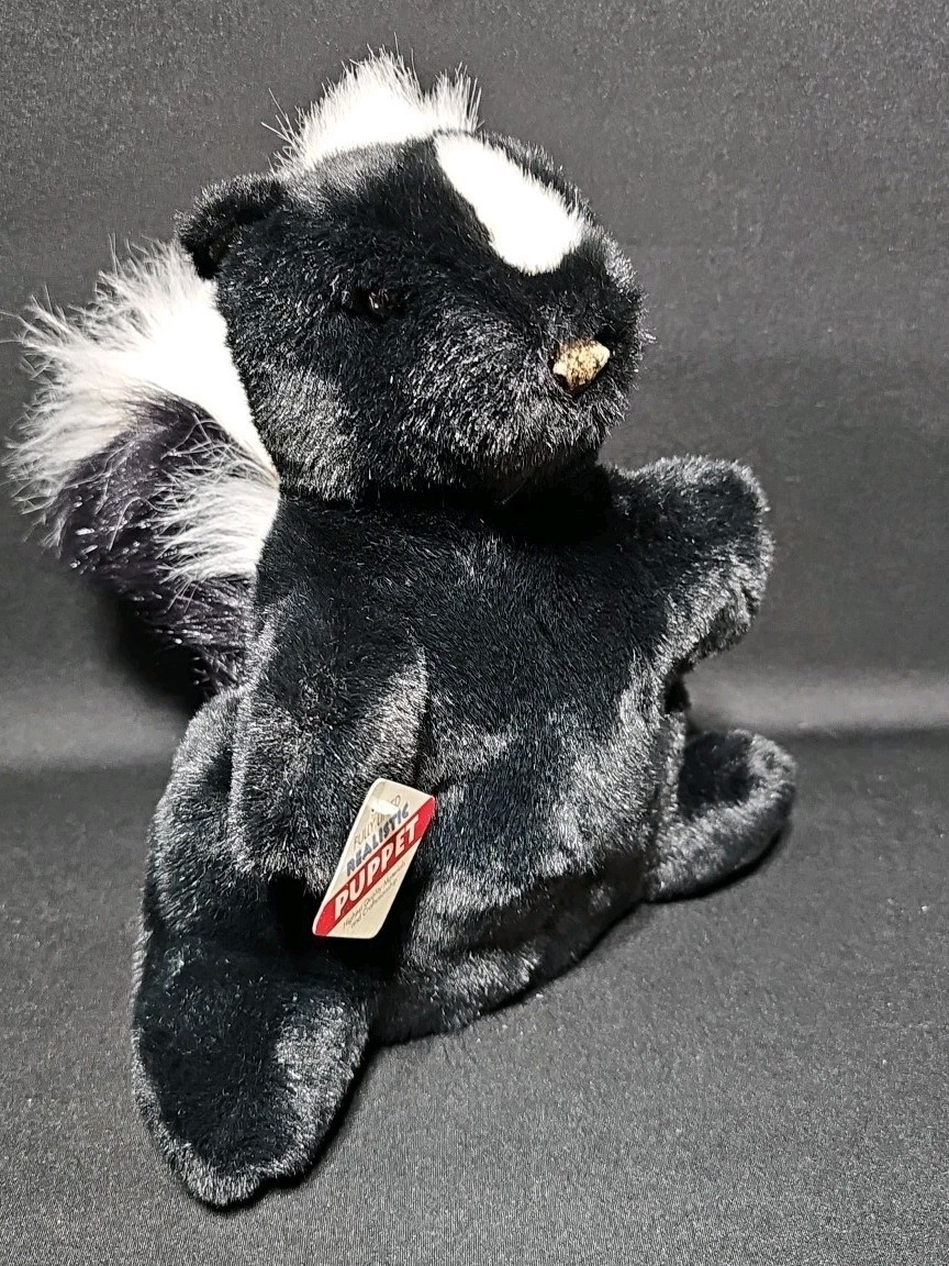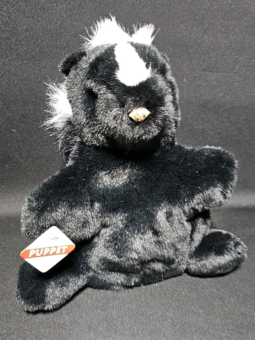 UP FOR SALE: This adorable vintage skunk hand puppet is made by Cascade Toy Co. as part of their Puppet Petz line. Made in the USA, this soft plush puppet features black fur with a white stripe, a fuzzy tail, and embroidered facial details. It?s cute, cuddly, and perfect for collectors, educators, or anyone who loves nostalgic toys.