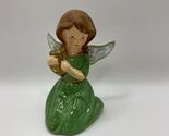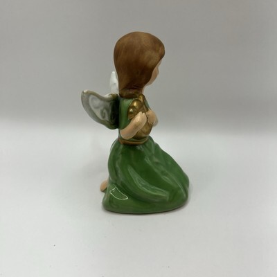 This charming vintage ceramic angel figurine features a hand-painted design with a green dress, brown hair, and white wings. She is depicted kneeling and holding a golden harp, symbolizing music and peace.