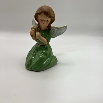 - Vintage Ceramic Angel Figurine Green Dress 4.5” Tall Harp Musician Hand-Painted