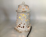 This is a vintage-style ceramic lighthouse electric lamp with a cutout design that casts a warm patterned glow when lit. Finished in white glaze with distressed accents for a rustic coastal look. Ideal for nautical decor, beach houses, or as an accent night light. Preowned in good working condition with light wear to the finish.