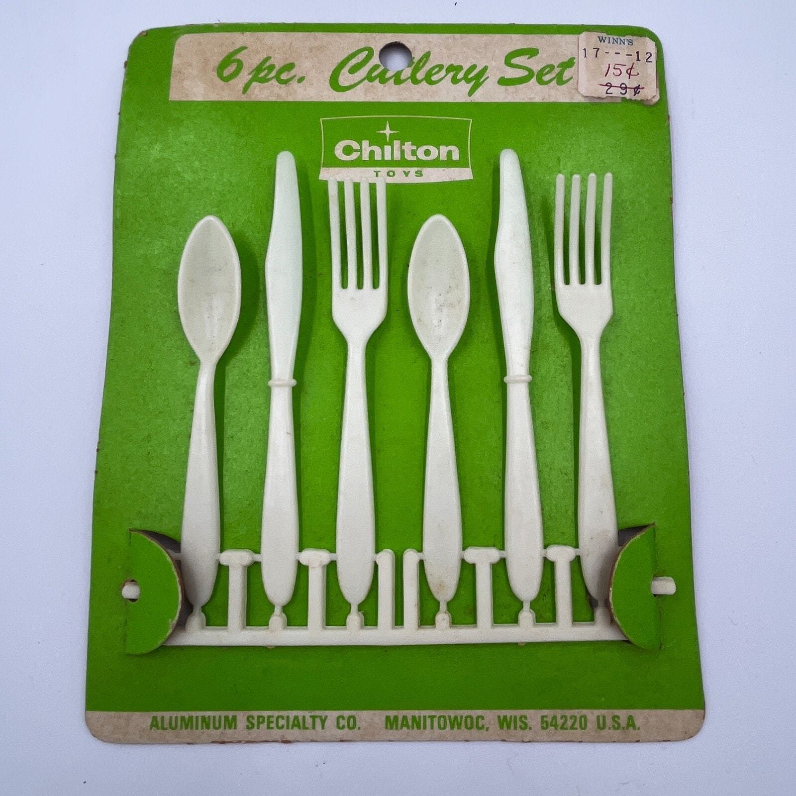 Vintage Chilton Toy's 6 Piece Cutlery Sets unused and on the original cardboard packaging. This is for 3 identical sets. Plastic silverware including knives, forks spoons. They are "new" but due to age and storage they do have some discoloration and markings on them.