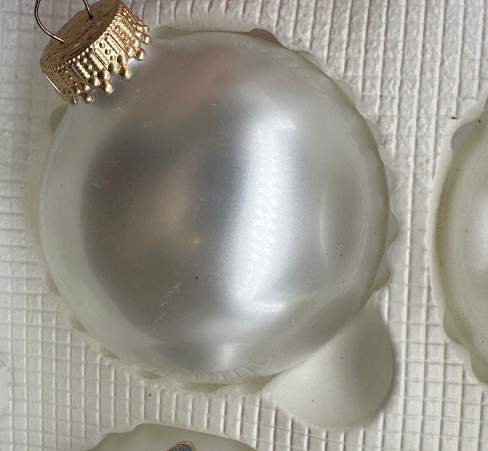 Light colored (soft blue, green and coral) figures on a white pearlized ball with gold "Krebs" crowns