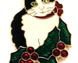 - Vintage Christmas Cat Pin Black White Enamel Kitty Holly Berry Holiday Jewelry