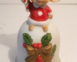 This vintage Christmas ceramic bell features a small size, measuring 4+ inches in height and 2 1/2 inches in length. The bell is adorned with a festive multicolor design and depicts a charming scene of a mouse holding a candy cane. Made of ceramic, this bell is unboxed and would make a delightful addition to any holiday decor collection. Perfect for adding a touch of whimsy to your Christmas celebrations, this bell is sure to bring joy and cheer to your home during the holiday season.