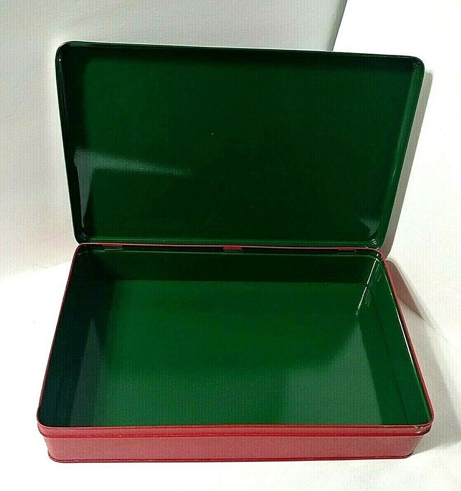 This amazing metal tin is hinged, works as expected, does have some scuffs and light scratches, also has a piece of clear tape on top